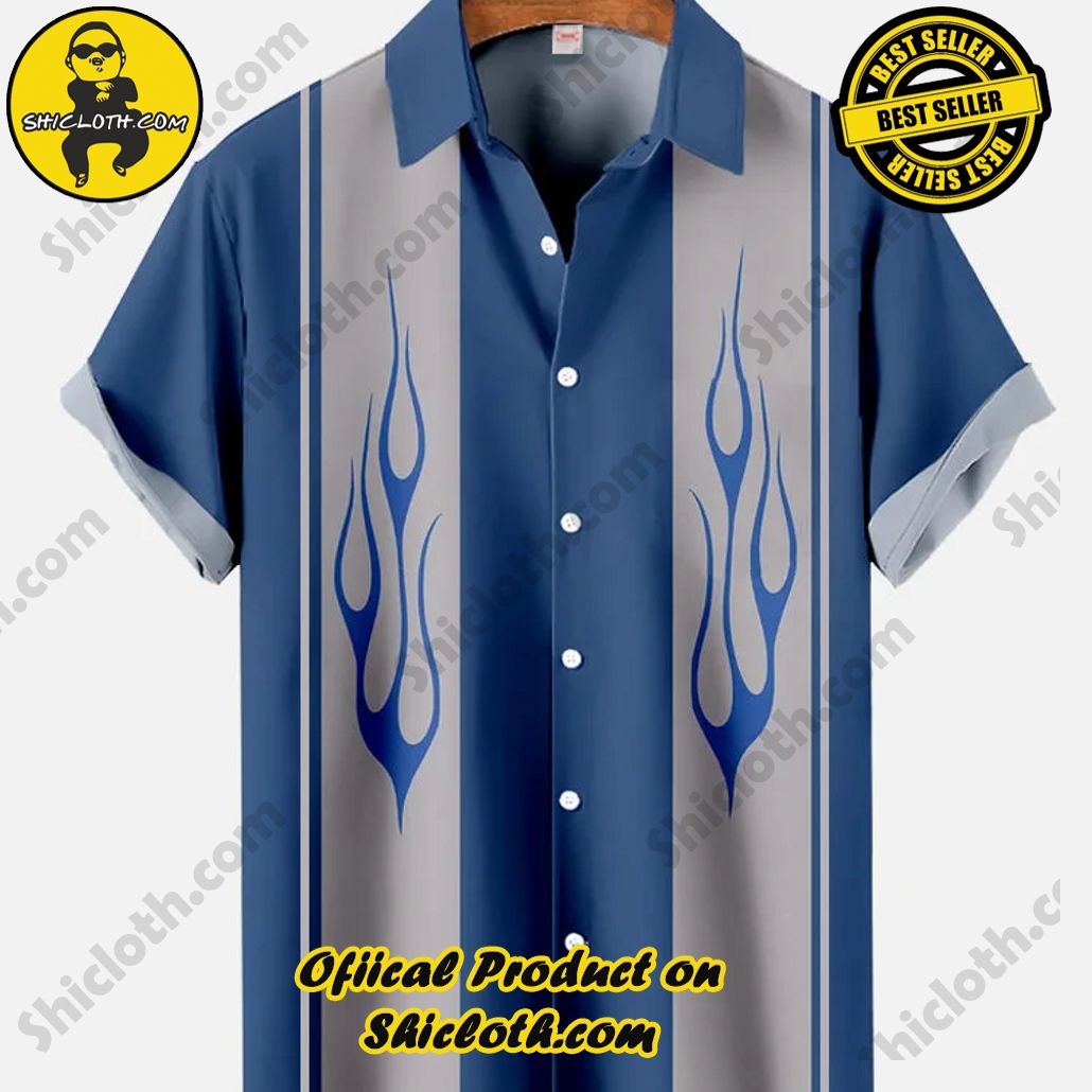 Retro Blue Contrast Color Stripes & Vogue Flames Patterns Printing Short Sleeve Shirt