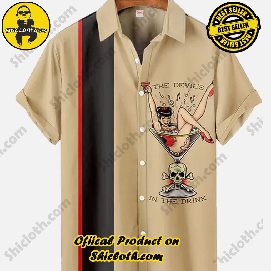 Retro Rock & Roll Art Wine Glass Beauty And Stripes Printing Short Sleeve Shirt