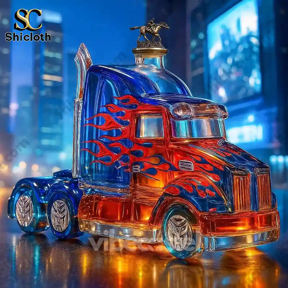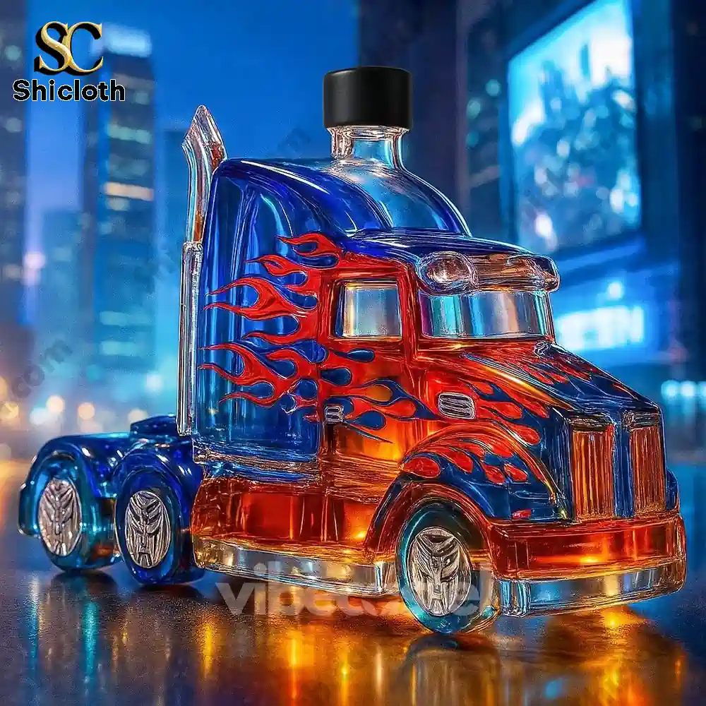 The bottle’s shape is a masterful recreation of the semi-truck, featuring incredible attention to detail. The glass is tinted deep Autobot Blue on the top half (cabin and smoke stacks) and a warm Prime Red on the lower half (hood and chassis). The most stunning feature is the intensely detailed blue and red flames licking across the cab and hood, perfectly mimicking Optimus Prime’s iconic movie design. The wheels and chrome accents are finely molded glass details, including two tall smokestacks, one of which cleverly forms the neck of the bottle!