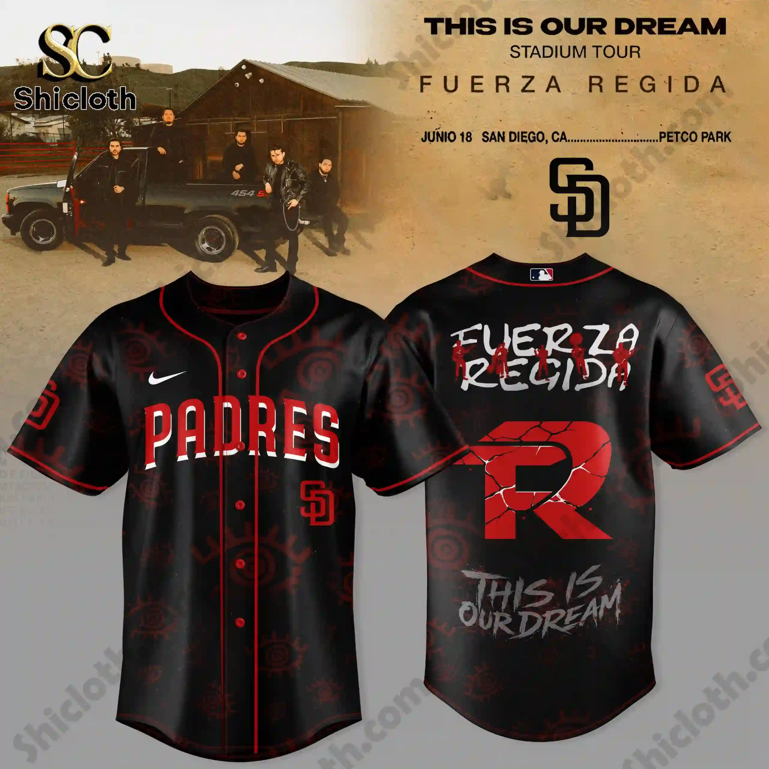 The San Diego Padres x Fuerza Regida “This Is Our Dream” Stadium Tour 2026 Jersey is a high-energy collaboration that blends Major League Baseball culture with the regional Mexican music scene. This limited-edition piece features a sleek black base with deep red accents, showcasing the iconic “Padres” script across the chest and the band’s “FR” logo on the back. Whether you are heading to Petco Park for a game or a concert, this jersey offers a bold, modern look that captures the spirit of San Diego’s vibrant community.