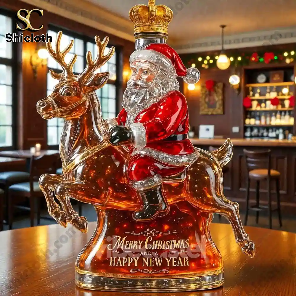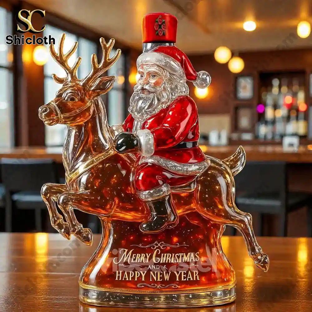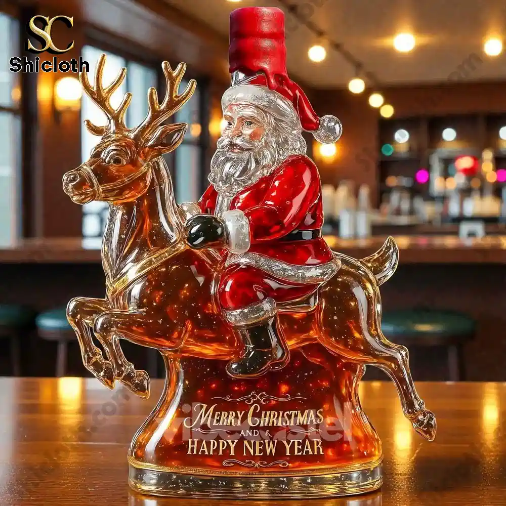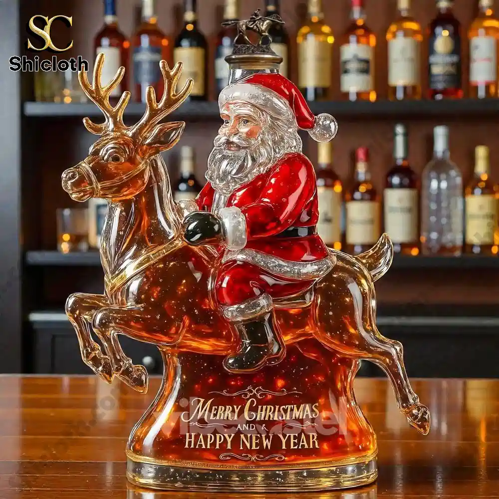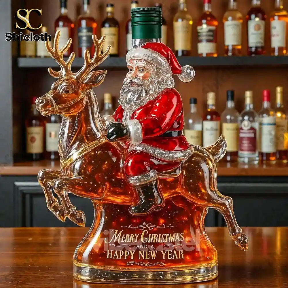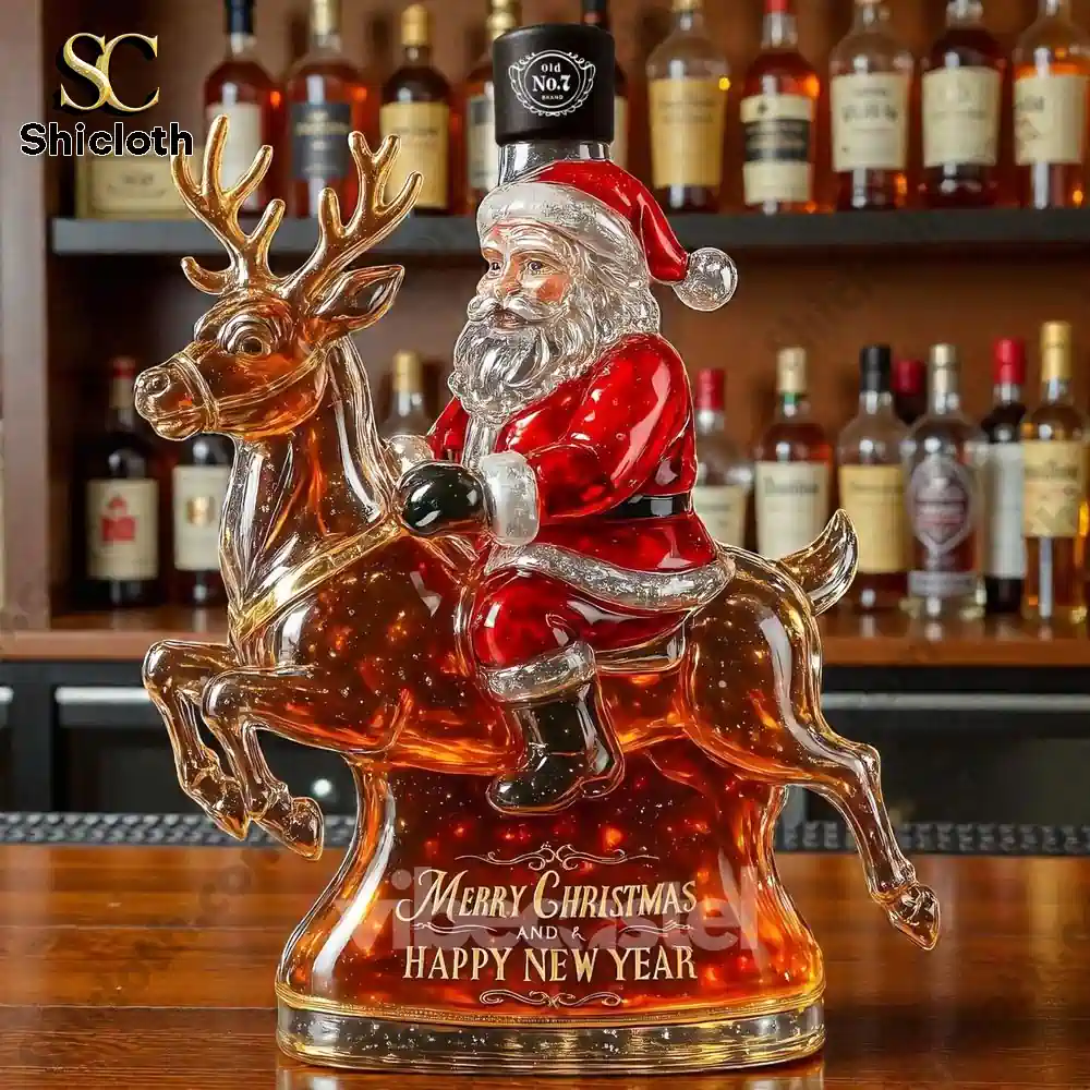 This is the ultimate holiday showstopper! The Santa Claus & Elk Limited Edition Whiskey Bottle isn’t just a container; it’s a stunning, detailed glass sculpture designed to elevate your Christmas decor and be the most memorable gift of the season. Featuring Santa riding a majestic elk, this premium glass decanter captures the festive spirit perfectly. The base is etched with “Merry Christmas and Happy New Year,” making it an instant heirloom. The real magic is in the versatility of the bottle stopper, allowing you to customize the look with caps representing iconic whiskey brands like Crown Royal (gold crown), Jack Daniel’s (black cap), Maker’s Mark (red cap), Blanton’s (rider on top), or Jameson (green cap).