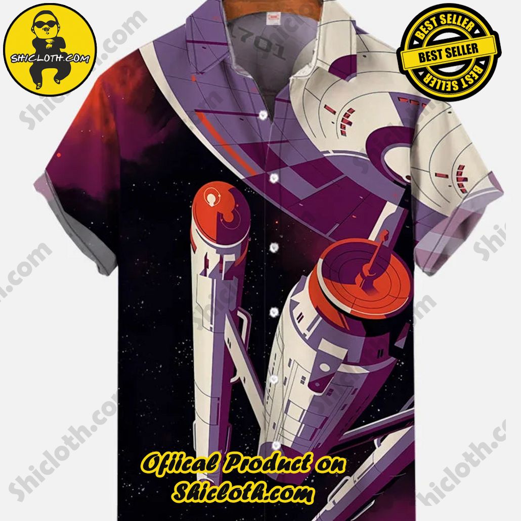 Sci-Fi Interstellar Travel Spaceship In Black Starry Sky Printing Short Sleeve Shirt