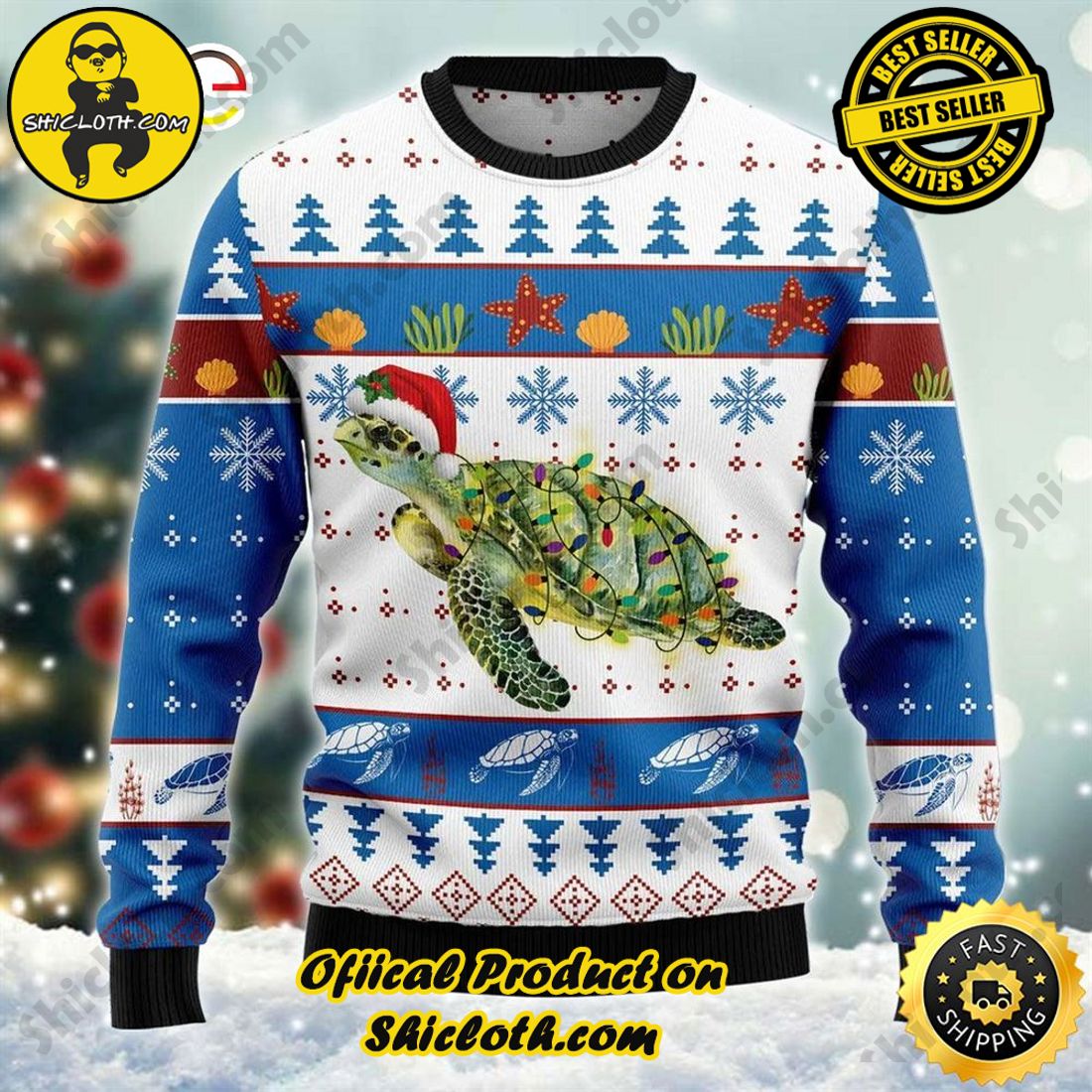 Sea Turtle Christmas Lights Funny Santa Hat Ugly Beer Sweater
