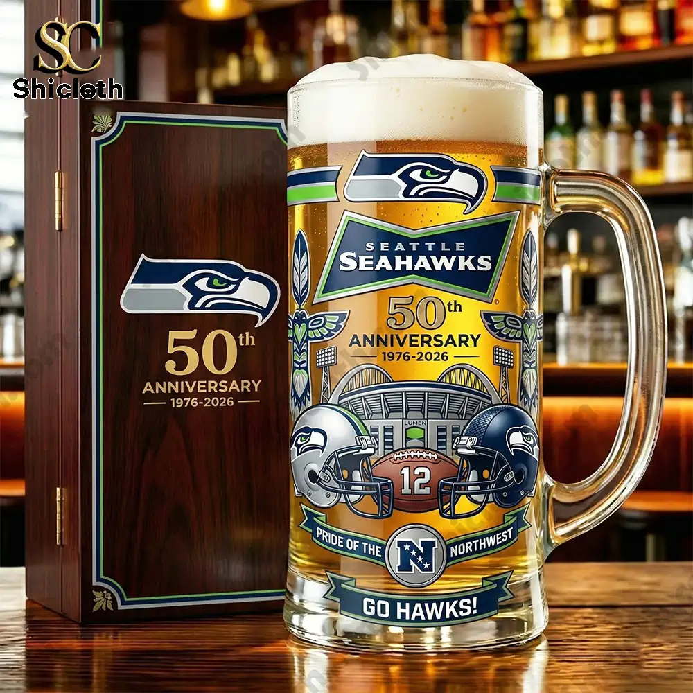 Raise a toast to five decades of football history with the Seattle Seahawks 50th Anniversary Commemorative Beer Glass. This beautifully crafted mug is a must-have for any member of the 12th Man looking to celebrate the team’s journey from 1976 to 2026. Featuring a rich color palette of college navy, action green, and wolf grey, the glass is adorned with intricate details including the iconic Seahawk logo, authentic totem pole motifs, and a detailed illustration of Lumen Field. The design is rounded out with images of two different era helmets flanking a football labeled “12,” and a “Pride of the Northwest” banner, all applied using high-quality dye-sublimation printing for a vibrant, lasting finish.