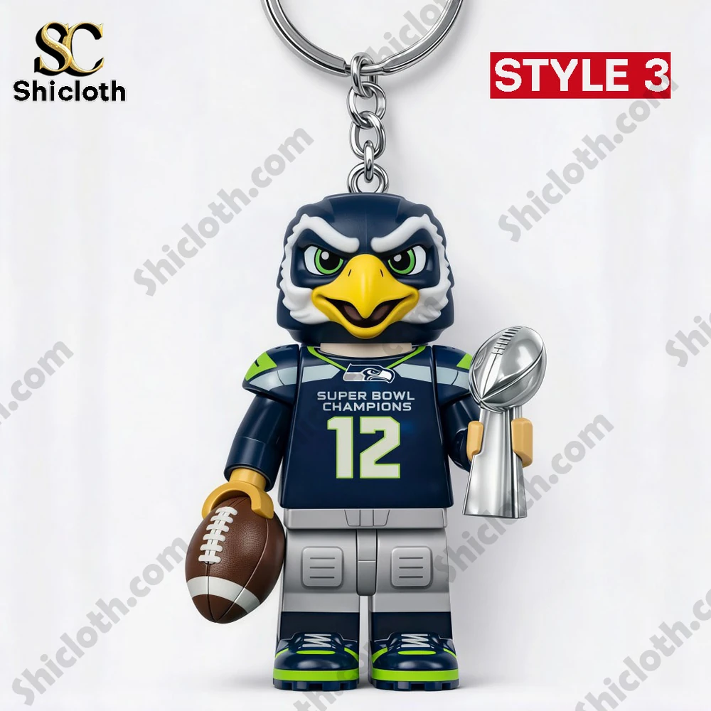 The Seattle Seahawks Super Bowl LX Champion 2026 Keychain is the perfect commemorative accessory for fans celebrating a future championship milestone. Available in three distinct designs, this collection captures the spirit of the 12s with high-quality craftsmanship. Style 1 features a Lego-inspired player figure wearing jersey number 9 with an “MVP” inscription, while Style 3 showcases a Seahawks mascot head on a similar figure, both holding a miniature silver Vince Lombardi Trophy. For those who prefer a classic look, Style 2 offers a miniature white football adorned with detailed player signatures and the official team logo, paired with a dedicated championship trophy charm.