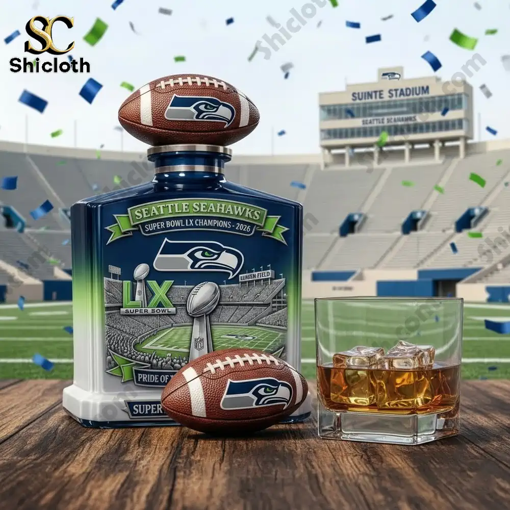 Commemorate a historic victory with the Seattle Seahawks Super Bowl LX Champions 2026 Pride of the Pacific Northwest Whiskey Bottle, a masterpiece designed for fans who value both team spirit and premium craftsmanship. This custom-shaped decanter features a striking deep navy-to-emerald gradient, mirroring the iconic colors of the Seahawks. The centerpiece of the bottle is a detailed relief of Lumen Field, set beneath the Super Bowl LX logo and the Vince Lombardi Trophy. Topped with a distinctive football-shaped stopper featuring the team’s hawk head logo, this bottle is crafted from high-quality glass that provides a substantial, luxury feel in the hand while preserving the flavor profile of your favorite spirits.
