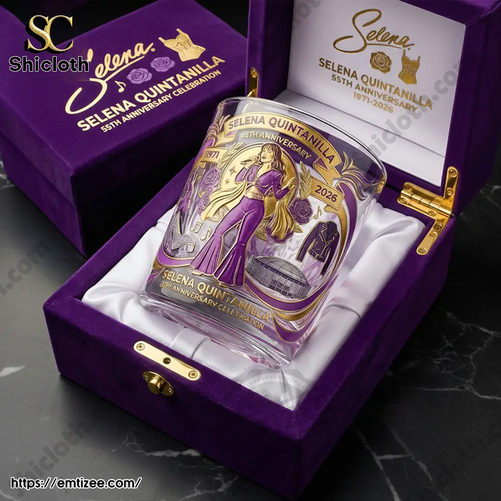 The Selena Quintanilla 55th Anniversary Commemorative Whiskey Glass (1971-2026) is a stunning tribute to the Queen of Tejano music. This premium 11-15oz glass features a vibrant purple and gold design, showcasing Selena in her iconic jumpsuit, surrounded by musical notes, roses, and the Houston Astrodome. It comes in a luxurious purple velvet display box with gold-tone hardware, making it a perfect collectible for fans or a sophisticated gift for any special occasion.