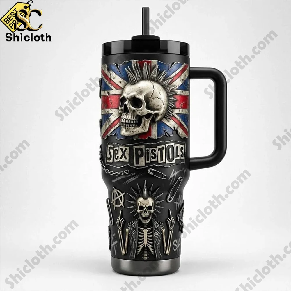 This tumbler features a striking 3D-effect design set against a matte black background. The focal point is a large mohawk-wearing skull positioned directly over a weathered Union Jack flag, with the iconic “Sex Pistols” logo printed in its classic ransom-note typography. Look closely and you will find intricate smaller details like safety pins, anarchy symbols, and a skeleton figure wearing a studded leather jacket. The product is crafted from high-quality inox stainless steel and utilizes a double-wall insulated design to ensure your ice stays frozen during summer beach trips and your coffee stays steaming hot during winter commutes. It includes a sturdy, ergonomic handle and a splash-resistant lid with a straw for convenient sipping on the go.