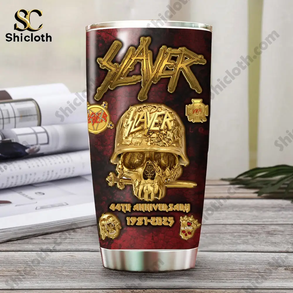 This Slayer 44th Anniversary Tumbler is the ultimate tribute to the titans of thrash metal, blending iconic “South of Heaven” imagery with rugged functionality. Celebrating the band’s legacy from 1981 to 2025, this cup features a deep crimson, cracked-texture background that makes the golden 3D-style graphics pop. Whether you are hitting a summer festival or just need your morning coffee to stay hot, this personalized tumbler is built for fans who live for heavy riffs and high-quality gear.