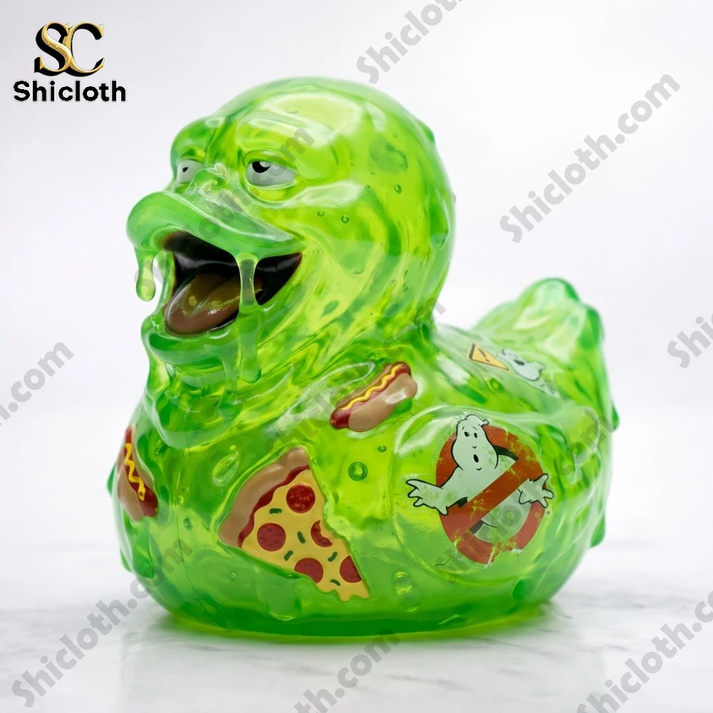 This collectible duck is crafted from a translucent lime green resin that mimics the gooey, ectoplasmic look of Slimer from the Ghostbusters franchise. The surface features a bubbly, melting texture, giving it a realistic “slime” appearance that glows under the right lighting. Across its body, you will find detailed graphics of Slimer’s favorite snacks, including vibrant pizza slices and mustard-topped hot dogs, alongside the classic “No-Ghost” logo on the side. Every detail, from the wide-open mouth with a protruding tongue to the slightly heavy-lidded eyes, captures the mischievous personality of the character perfectly.