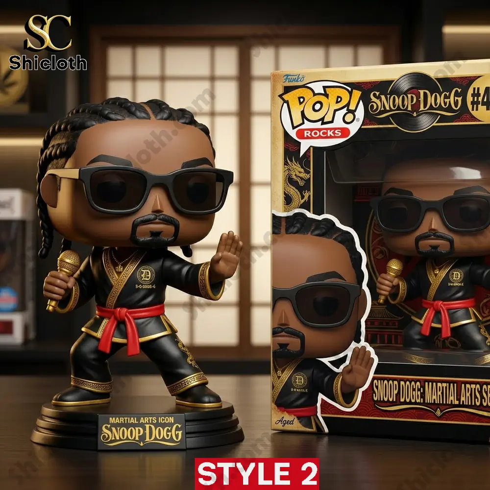 Looking for a unique collectible that blends hip-hop royalty with martial arts flair? The Snoop Dogg: Martial Arts Series Funko Pop-inspired figures are the perfect addition to any modern interior or fan collection. These striking pieces come in two distinct versions: Style 1, featuring Snoop with a signature cigar and smoke detail in a classic black gi, and Style 2, showcasing a more vibrant look with a gold-trimmed black gi and a red belt, while holding a golden microphone. Whether you are a dedicated “Doggfather” fan or a collector of “Shicloth London” exclusives, these figures offer a sleek, high-end aesthetic that stands out on any shelf.