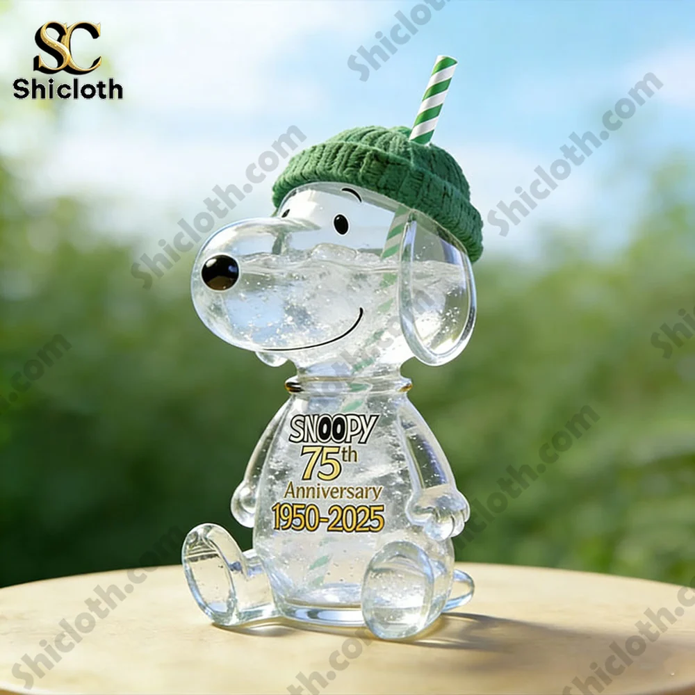 This bottle is a masterclass in detail, featuring a custom-shape high-quality glass body that perfectly replicates Snoopy sitting down. The clear glass lets you see the bubbles in your drink, making it look like Snoopy is filled with sparkles. On his chest, you will find the commemorative text “SNOOPY 75th Anniversary 1950-2025” printed in a classic Peanuts-style font with gold and black accents. To top it off, he is wearing a real green knitted beanie hat that acts as a cozy cover for the lid, and it even comes with a matching green and white striped straw.