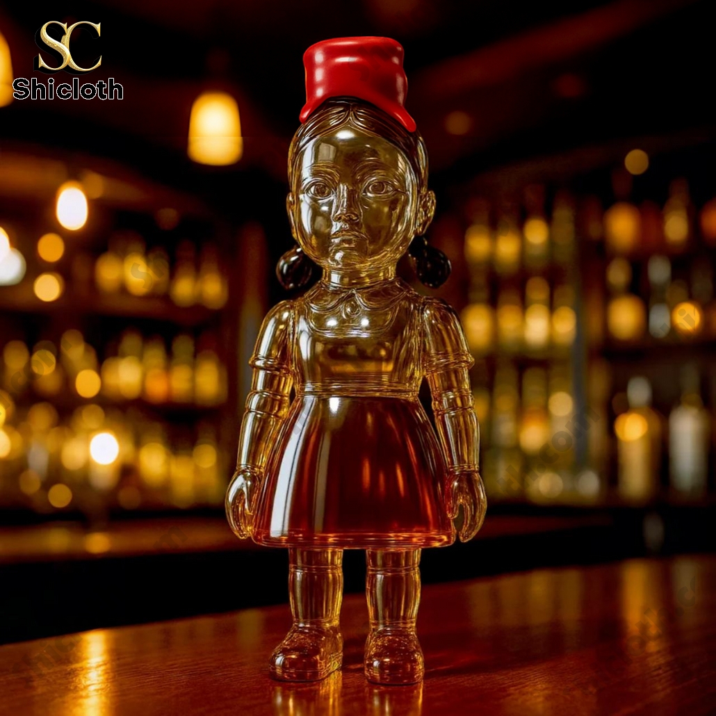 The Squid Game Young-hee Doll Whiskey Bottle comes in several striking variations, each featuring detailed design elements. These bottles are crafted to resemble the iconic Young-hee doll from the famous series, adding a unique twist to whiskey packaging. The bottles are made from clear, glossy plastic with a slight amber tint, giving them an elegant yet playful appearance. The doll’s face is highly detailed, with expressive eyes, a serious expression, and delicate features that stand out, providing a touch of character to the bottle. The doll’s outfit includes a skirt with a polished, reflective look, and the arms and legs have visible, intricate contours that mimic real movement.