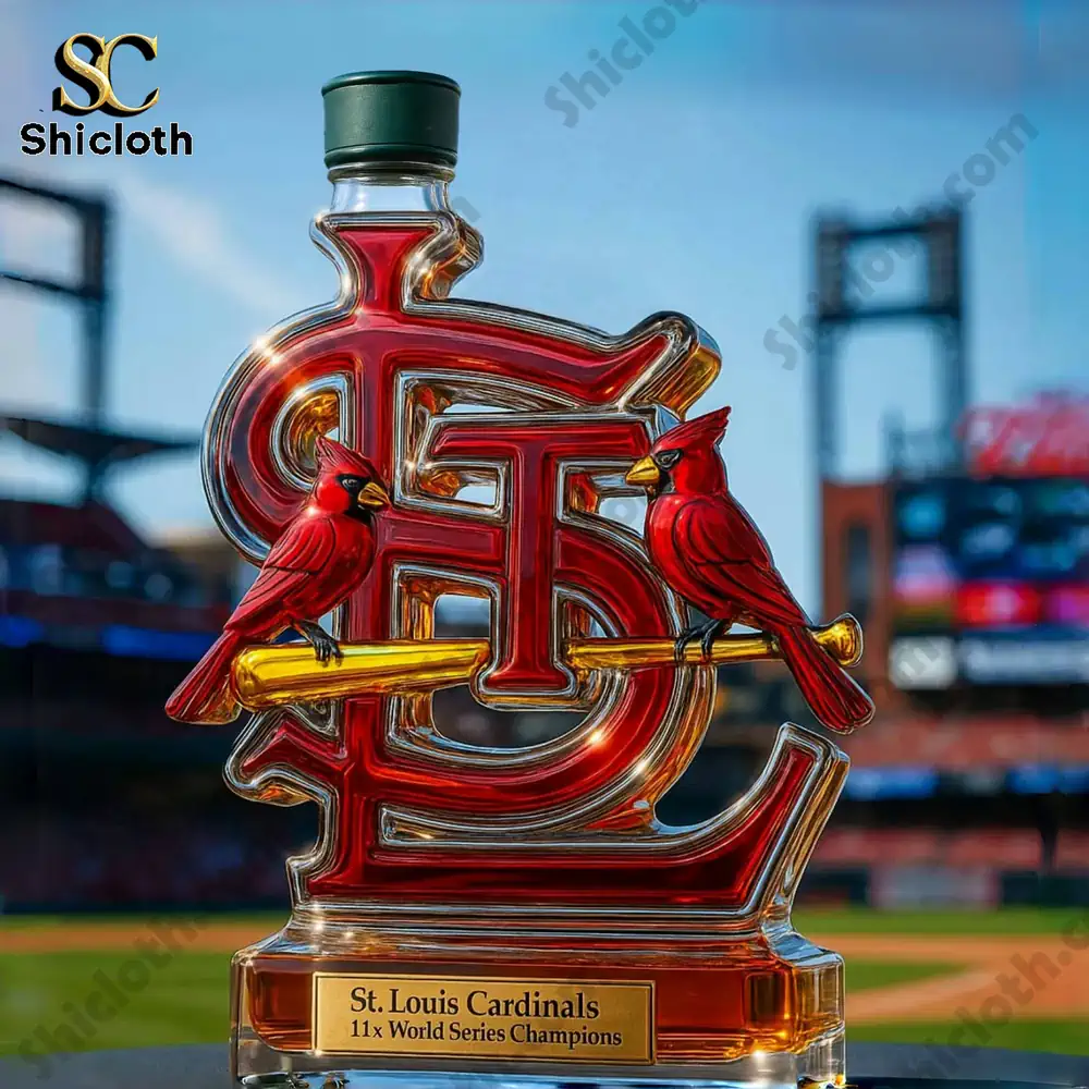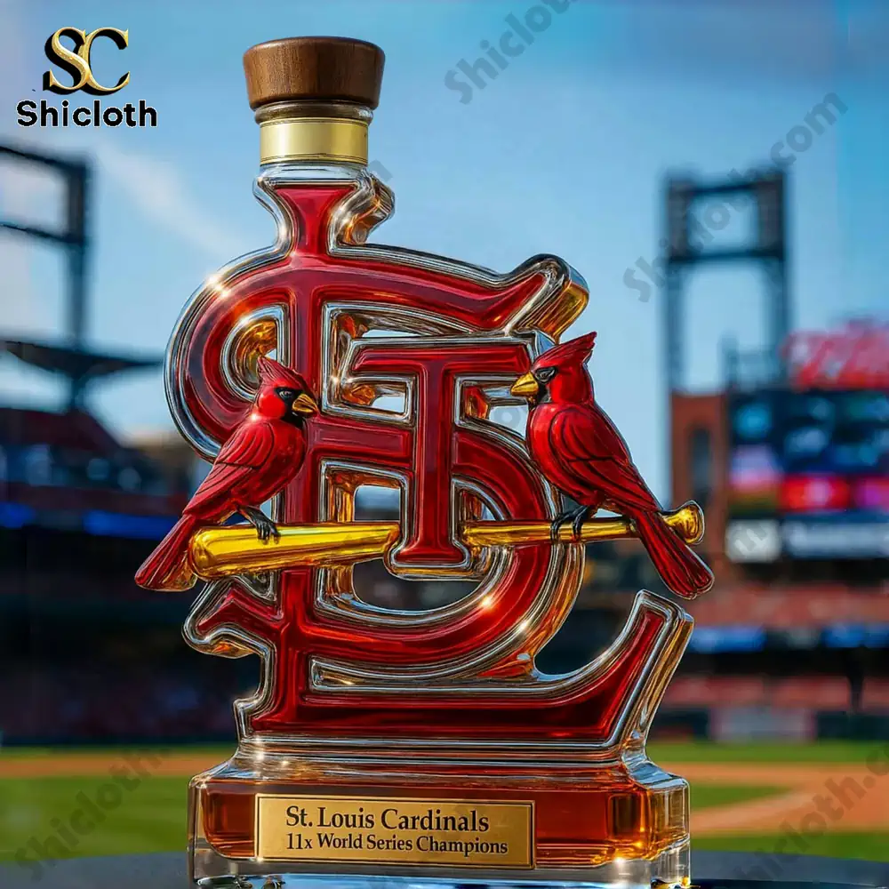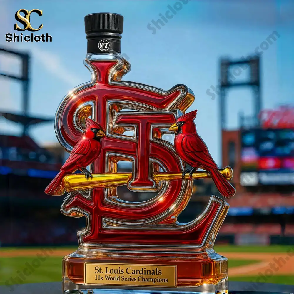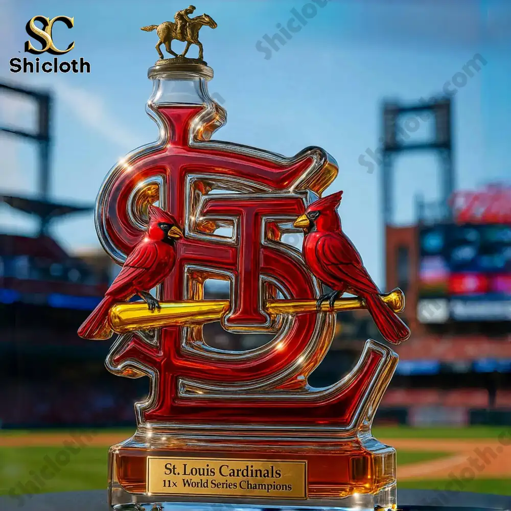 This stunning decanter, approximately 20 x 10 (cm) with a 350ml capacity, is crafted from premium, high-quality glass. The “STL” logo is boldly rendered in deep red and shimmering gold accents, featuring two bright red cardinals perched on a golden baseball bat. Below the main logo, a gold-plated plaque proudly states “St. Louis Cardinals 11x World Series Champions,” emphasizing the team’s legendary status. You’ll notice the details: the polished glass clarity showcases the liquor within (or the beautiful amber color of an empty bottle), and the variety of stoppers offer different aesthetic touches, such as a luxurious Crown Royal crown, a sleek Jack Daniel’s black cap, or a classic Blanton’s horse-and-jockey figurine. This level of detail and craftsmanship ensures a truly unique and high-value collectible.