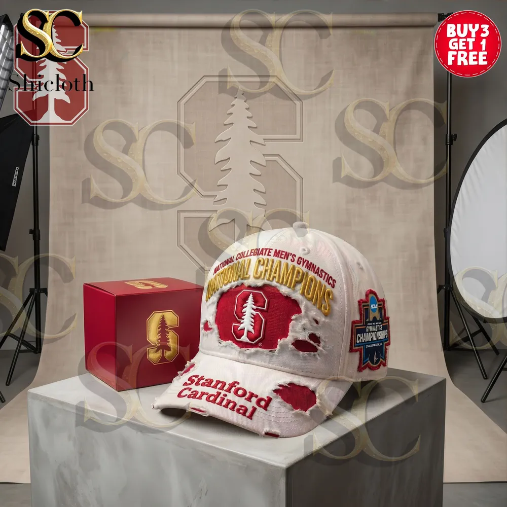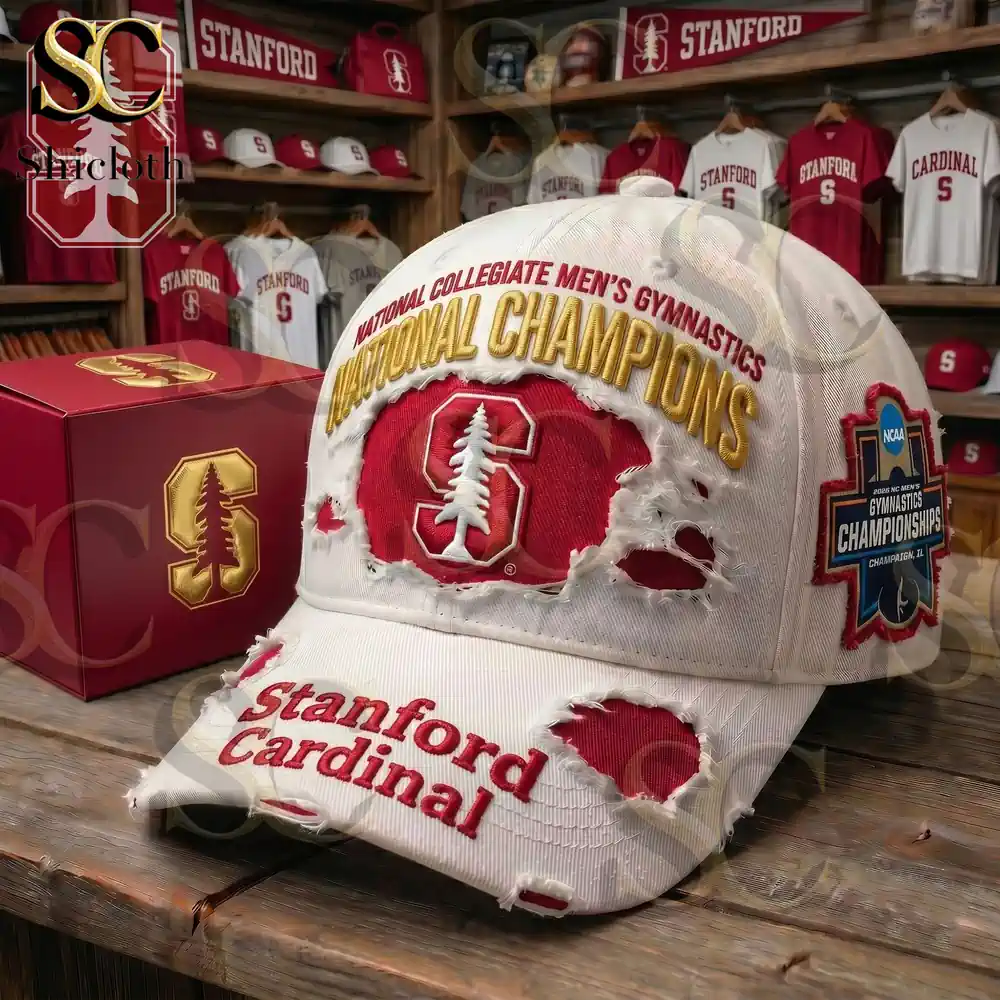 The collection features two distinct styles to suit different tastes. The first is a classic cardinal red cap with a clean, structured finish, featuring the iconic “S” tree logo centered between the years 20 and 26. The second is a vintage-inspired off-white “distressed” version, which incorporates stylish ripped-fabric overlays and raw edges for a rugged, modern streetwear look. Both versions prominently display “National Champions” in bold, raised gold and white embroidery across the front, with “Stanford Cardinal” elegantly curved along the brim. A specialized 2026 NCAA Men’s Gymnastics Championships patch is meticulously stitched onto the side, ensuring every angle of this hat celebrates the win.