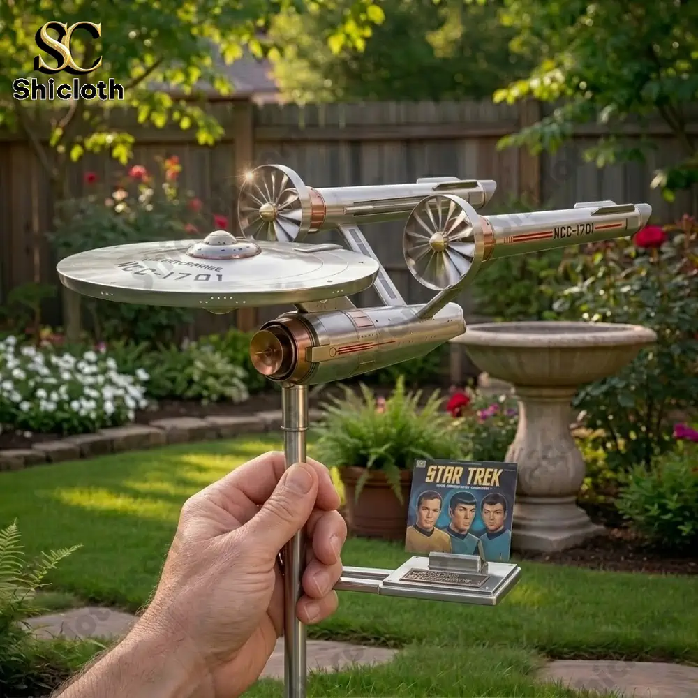 The Star Trek USS Enterprise NCC-1701 Wind Spinner For Garden is a masterfully crafted outdoor kinetic sculpture that brings the legendary Constitution-class starship to your backyard. This garden ornament features a high-quality metallic silver finish with authentic red and gold accents that replicate the iconic look of the original series vessel. The design incorporates a spinning primary saucer section and dual turbine blades located at the front of the warp nacelles, allowing the entire ship to react dynamically to the wind. Each piece is meticulously detailed with the NCC-1701 registration clearly printed on the saucer and nacelles, ensuring it looks like a genuine collector’s item while serving as a functional weather vane or garden focal point.