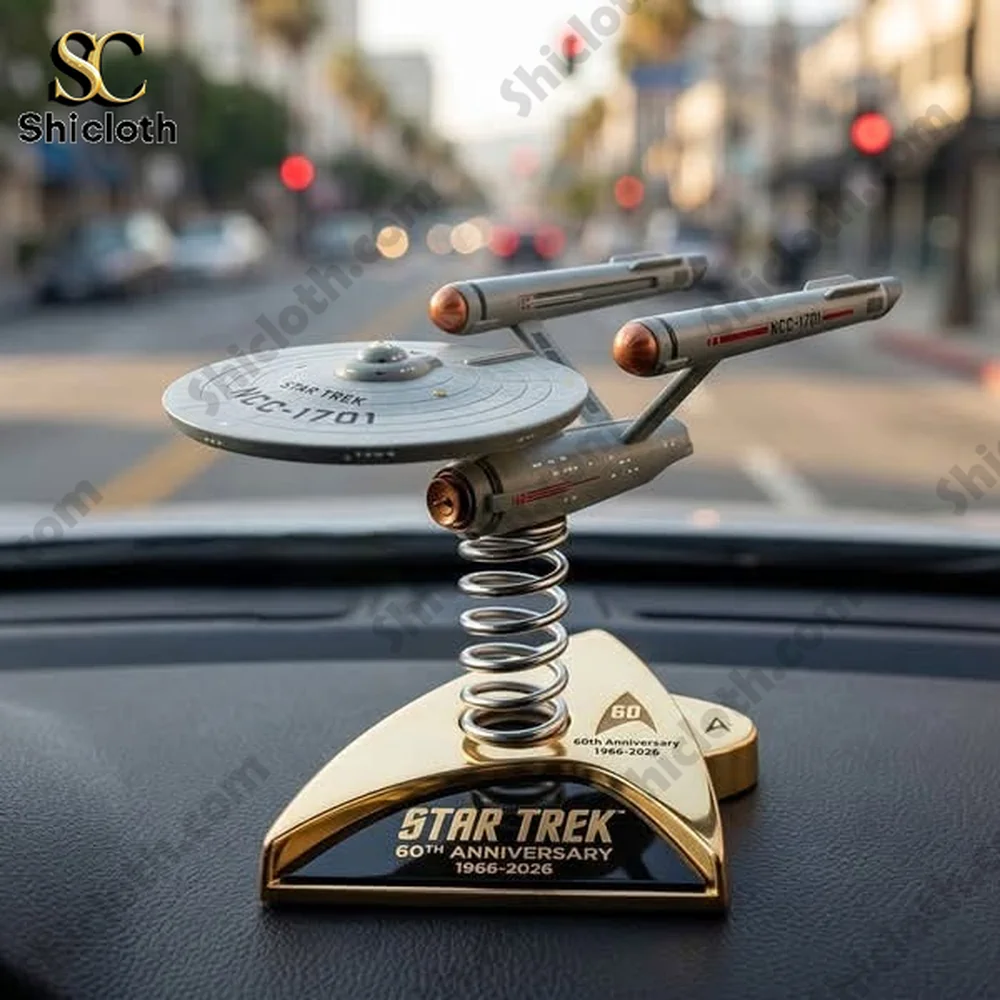 For Trekkies, the USS Enterprise NCC-1701 model is a standout, celebrating the 60th Anniversary (1966–2026). This piece features the classic saucer section, twin warp nacelles with copper-toned bussard collectors, and the secondary hull, all finished in a realistic matte grey with red accent stripes. It sits atop a triangular gold-plated Starfleet Command insignia base with a black plaque. The spring mechanism is tucked neatly under the primary hull, ensuring a smooth bobbling motion. These products are crafted from durable PVC and high-grade alloys, making them resistant to sun exposure and heat behind your windshield.