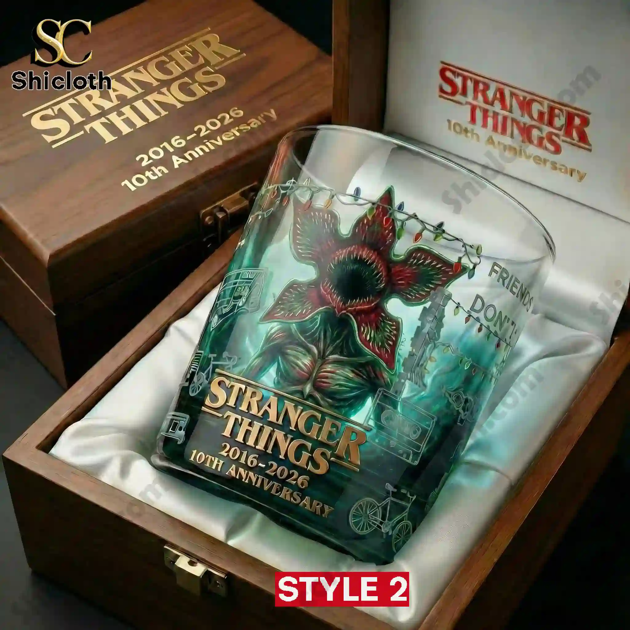 The collection offers two striking visual styles, both utilizing high-quality dye-sublimation printing for vibrant, lasting colors. Style 1 features a bold red and blue gradient glass showcasing Steve Harrington in his Scoops Ahoy uniform alongside Dustin Henderson, framed by the classic “Friends Don’t Lie” motto. Style 2 offers a more haunting aesthetic with a menacing Demogorgon centered among tangled Christmas lights on a teal and clear glass. Both versions include the official show logo and the “2016-2026” anniversary dates prominently on the front. Every glass comes nestled in a luxurious wooden display box lined with white satin, featuring gold-engraved branding on the lid that makes it a standout decorative piece.
