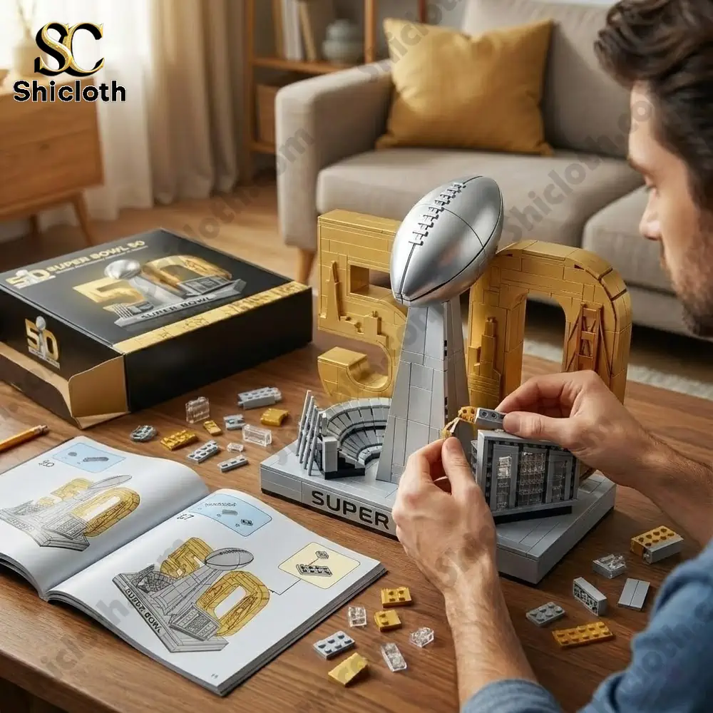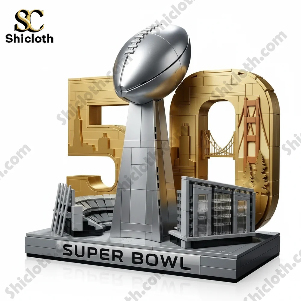 The Super Bowl 50 Brick Set is a stunning commemorative display piece that captures the essence of the “Golden Anniversary” of the NFL’s biggest game. This intricate model features a prominent silver Vince Lombardi Trophy standing tall in the center, flanked by a large, golden number 50 that incorporates iconic San Francisco landmarks like the Golden Gate Bridge. The base is designed with detailed miniature recreations of Levi’s Stadium, providing a complete 3D tribute to the historic matchup between the Denver Broncos and the Carolina Panthers.