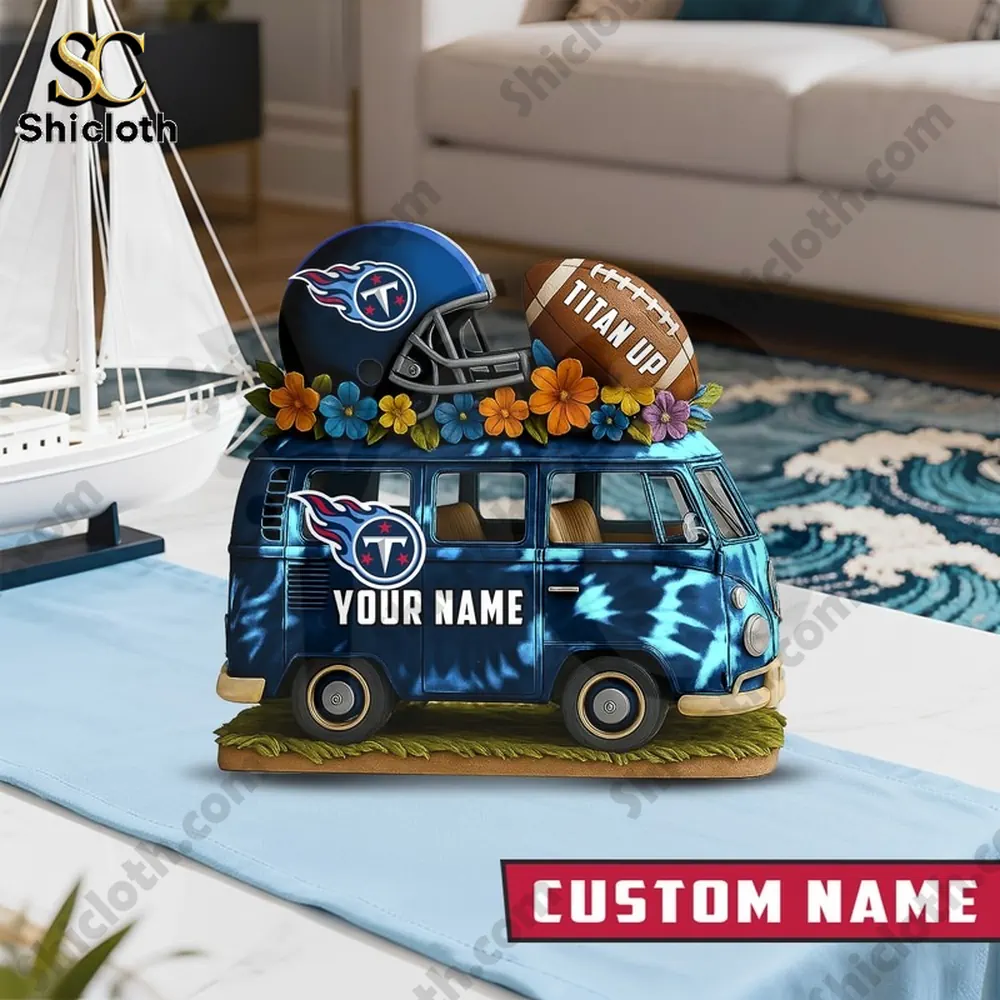 The design is centered on a vintage-style bus sporting the iconic Tennessee Titans logo and a dedicated space for a customizable name on the side door. Every detail is carefully rendered, from the silver-toned trim and wheels to the small blue and orange floral accents that line the roof. The entire scene sits on a realistic grass-textured base, giving it a three-dimensional look even as a flat display. Measuring 1.5cm in thickness, the plaque is substantial enough to stand firmly on any flat surface, making it an excellent addition to a bookshelf, desk, or bedside table.