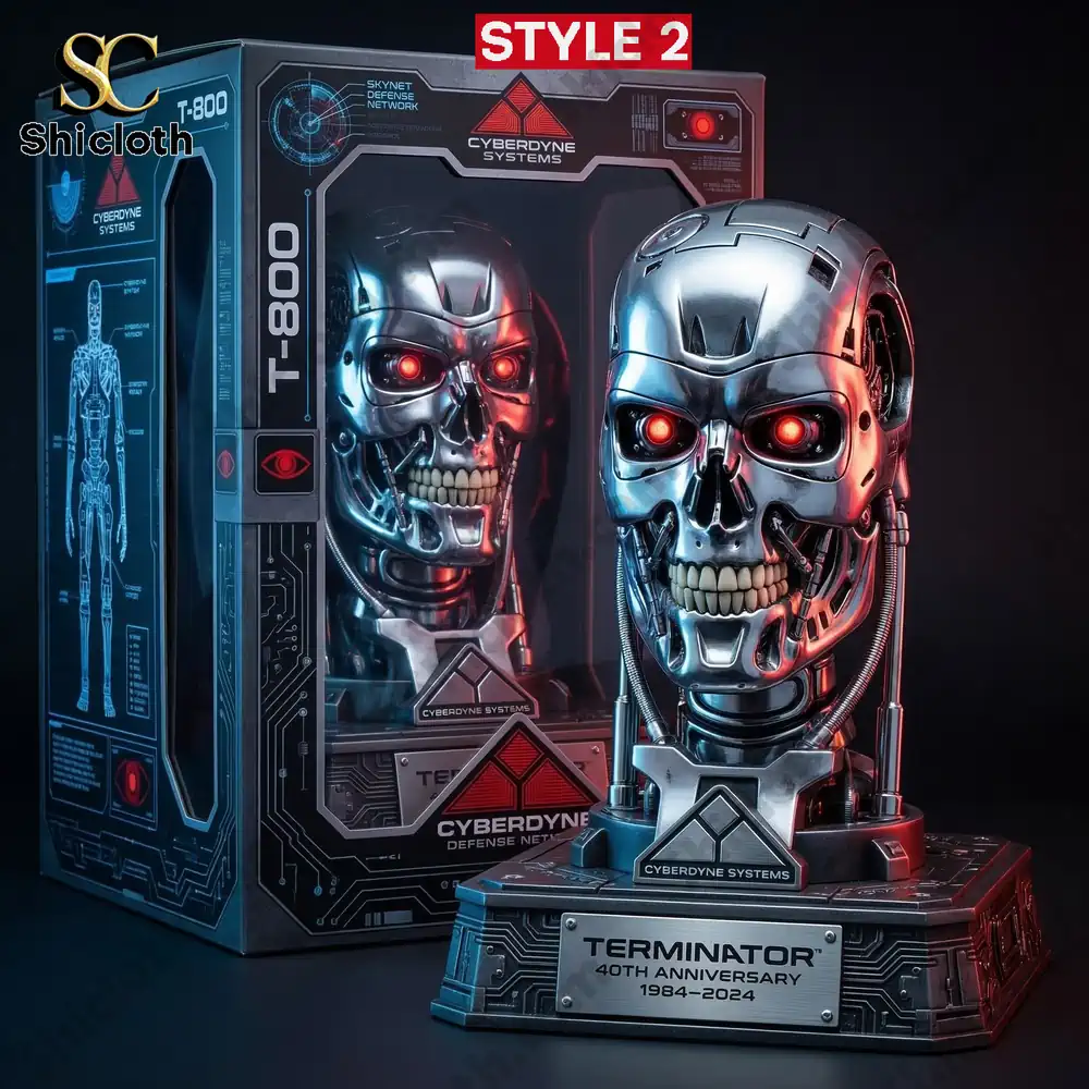 This collection features two distinct styles, each housed in a custom Cyberdyne Systems themed window box. Style 1 showcases a stylized T-800 with a half-exposed endoskeleton face, captured in a classic leather jacket pose while wielding a shotgun on a debris-filled base. In contrast, Style 2 is a highly detailed chrome-finished endoskeleton bust mounted on a heavy industrial pedestal. Both versions prominently feature the “40th Anniversary 1984-2024” silver plaque and glowing red LED eyes that bring the cyborg to life. The craftsmanship utilizes high-grade PVC and metallic-coated resins to simulate the cold look of futuristic alloys. Small details like the hydraulic pistons near the neck, the exposed cranial wiring, and the authentic “Cyberdyne Defense Network” branding on the packaging ensure this is a true collector-grade item.
