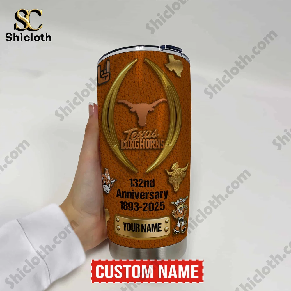 If you are a die-hard fan looking to commemorate a massive milestone, this Texas Longhorns 132nd Anniversary Custom Name Tumbler Cup is the ultimate tribute to the burnt orange legacy. Featuring a rugged, leather-textured background, this tumbler celebrates the program’s history from 1893 to 2025. It is packed with iconic imagery, including the legendary Hook ’em Horns hand sign, the Texas state silhouette, and various iterations of the Bevo mascot. One side prominently displays a massive golden Longhorn logo centered within a football-shaped frame, while the reverse side showcases a detailed top-down view of the Darrell K Royal-Texas Memorial Stadium. To make it truly yours, there is a dedicated “Your Name” nameplate at the base, allowing for a personalized touch that stands out at any tailgate.