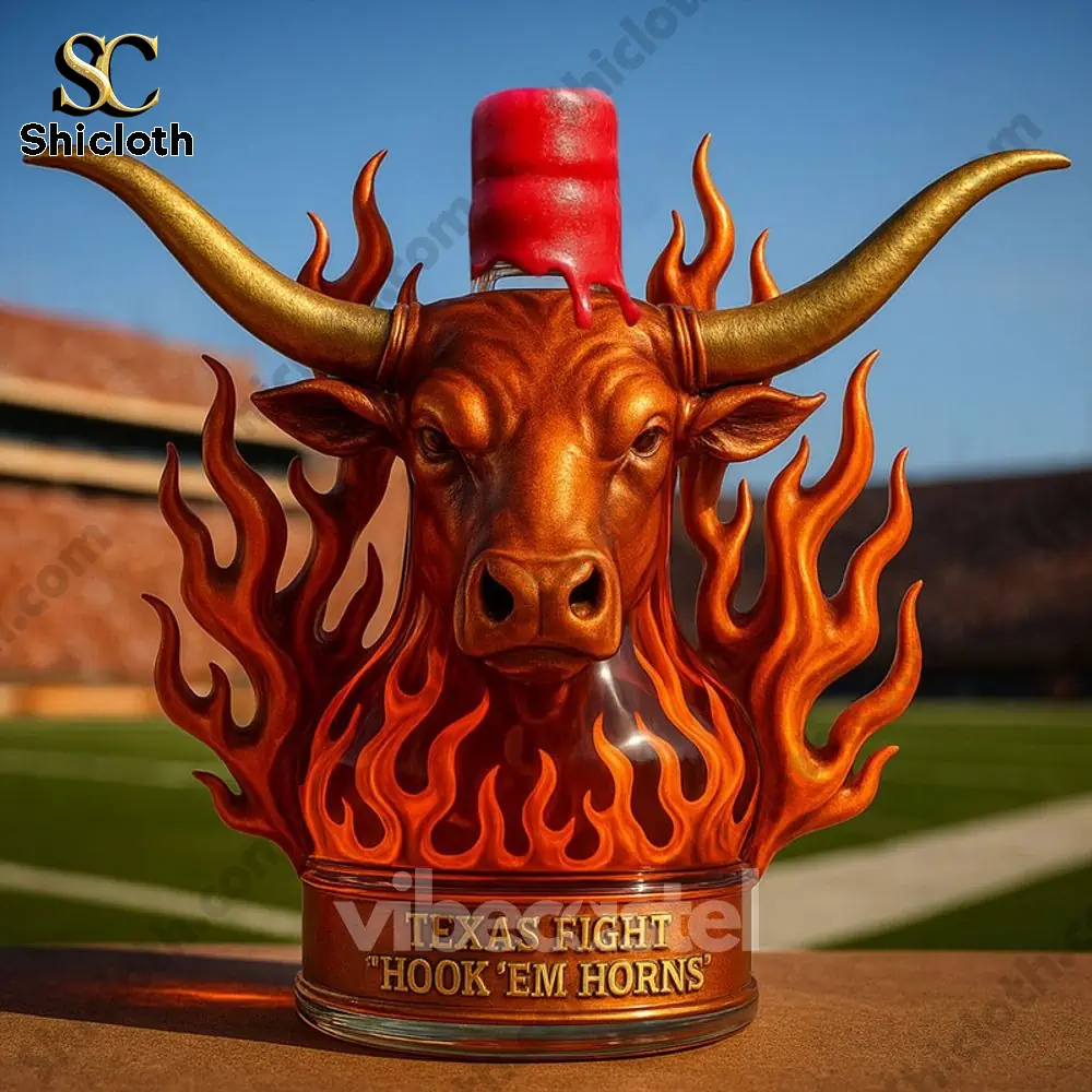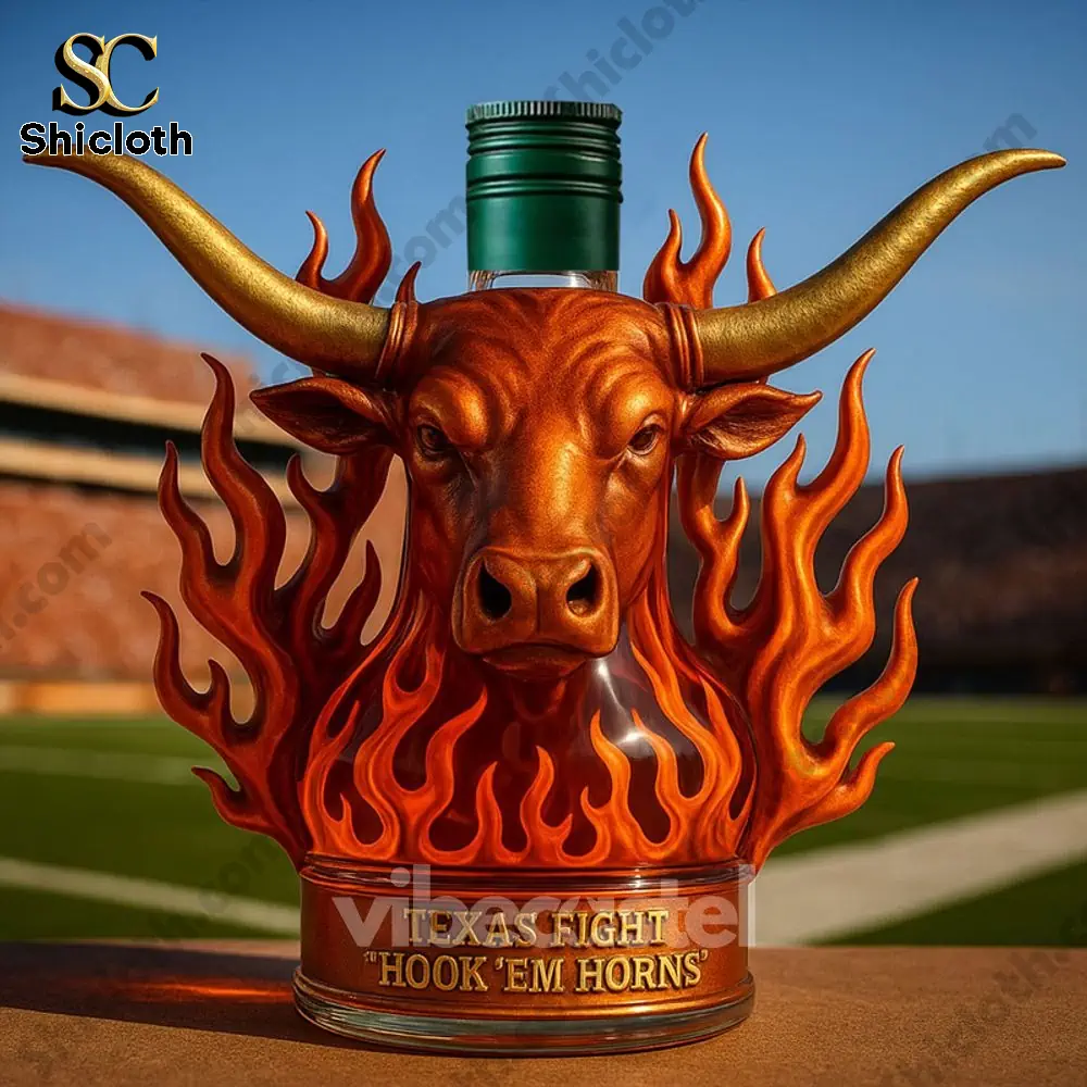The design is pure Texas power! The bottle is dominated by a fiercely realistic, three-dimensional Longhorn head, finished in a rich, metallic Burnt Orange. Surrounding the head is a roaring blaze of sculpted flames, also in Burnt Orange and deep Red, giving the impression that the Longhorn is charging out of a fire. The massive, curved horns are finished in a contrasting brilliant metallic Gold, making them shine under any light. The neck of the bottle emerges from the Longhorn’s forehead. The wide glass base features a proud, embossed band that reads “TEXAS FIGHT” above the famous motto, “HOOK ‘EM HORNS”.
