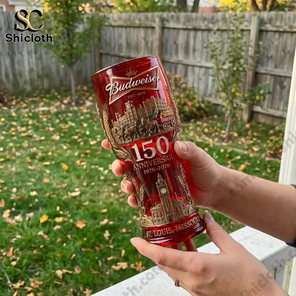 This stunning glass features a deep, ruby-red translucent finish that catches the light beautifully, whether you’re outdoors or under dim bar lights. The front is adorned with intricate, raised golden relief detailing depicting the iconic St. Louis brewery, the world-famous Clydesdale team pulling a beer wagon, and the historic clock tower at the base. Centered prominently is the “150 Anniversary” text along with the dates “1876-2026,” all set beneath the classic Budweiser bow-tie logo. The textured wheat stalks framing the sides add a tactile grip and a nod to the natural ingredients of the brew.