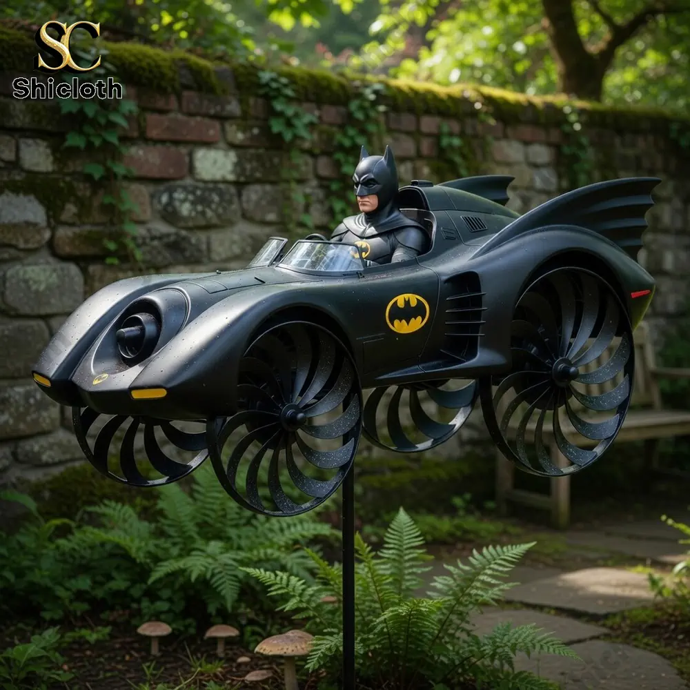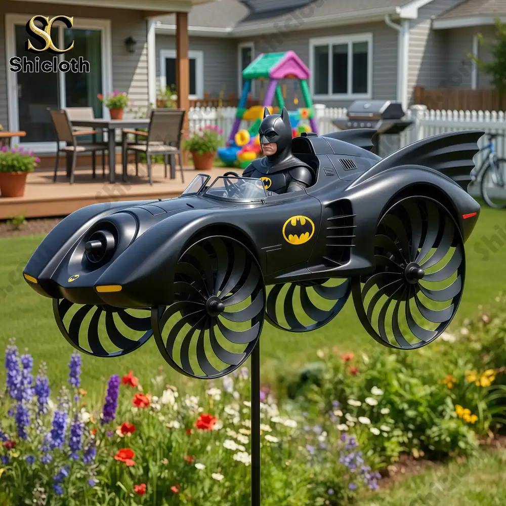 The Dark Knight Batman Wind Spinner is a unique outdoor kinetic sculpture that combines the nostalgic charm of classic garden ornaments with the legendary aesthetic of Gotham City’s protector. This decorative piece features a highly detailed Batmobile model, inspired by the 1989 cinematic design, serving as the main body. The vehicle is finished in a sleek matte black coating, accented by the iconic yellow and black Batman emblem on the side doors and front hood. Instead of traditional wheels, the spinner is equipped with four wide-diameter turbine blades that rotate fluidly even in light breezes. A miniature Batman figure is positioned in the open cockpit, grasping the steering wheel, which adds a sense of action and scale to the overall presentation.