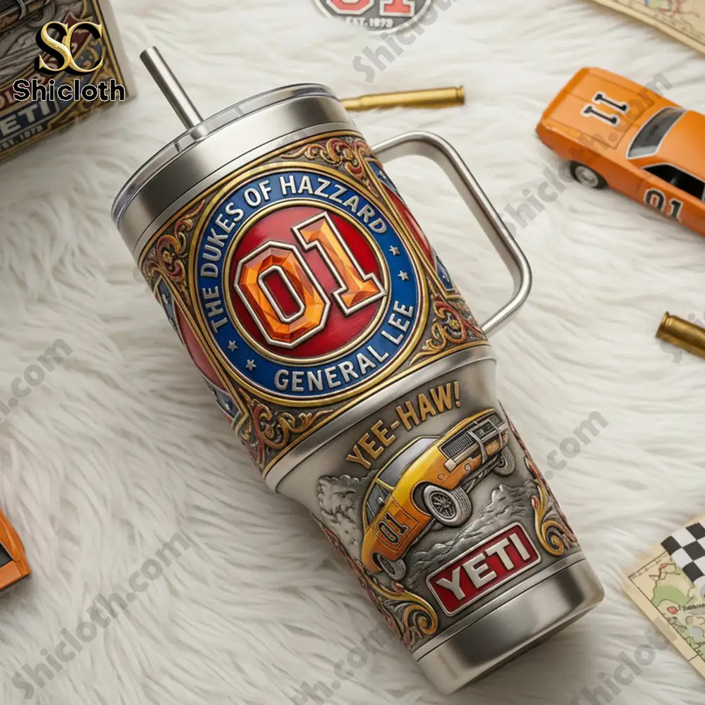 This Dukes of Hazzard General Lee Yeti Tumbler is a dream come true for fans of the classic show, blending rugged nostalgia with high-performance cooling. This custom stainless steel mug features a stunning 3D-embossed design, showcasing the iconic General Lee 01 racing number prominently in the center, framed by elegant golden filigree and a vibrant blue border. Below the main logo, you will find a detailed relief of the famous orange Dodge Charger jumping through the air, complete with the classic Yee-Haw! catchphrase. Every inch of this tumbler is packed with detail, from the textured Yeti branding at the base to the intricate patterns that wrap around the sturdy handle, making it a functional piece of art for your collection.