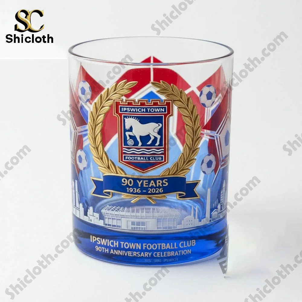 This whiskey glass features a sophisticated and detailed layout that captures the essence of Portman Road. The center of the glass is dominated by the official Ipswich Town Football Club crest, featuring the iconic white horse, framed by a golden laurel wreath. Below the crest, a blue ribbon proudly displays “90 Years” and the years “1936 – 2026.” The lower portion of the glass is etched with a white architectural skyline of the stadium, contrasted against a deep blue base. Small details like football patterns and red-and-blue geometric shapes wrap around the sides, all applied using high-quality dye-sublimation printing for a vibrant finish. With a weight and size of 11-15oz, the glass feels substantial in your hand, making it perfect for sipping your favorite spirit while watching the match.