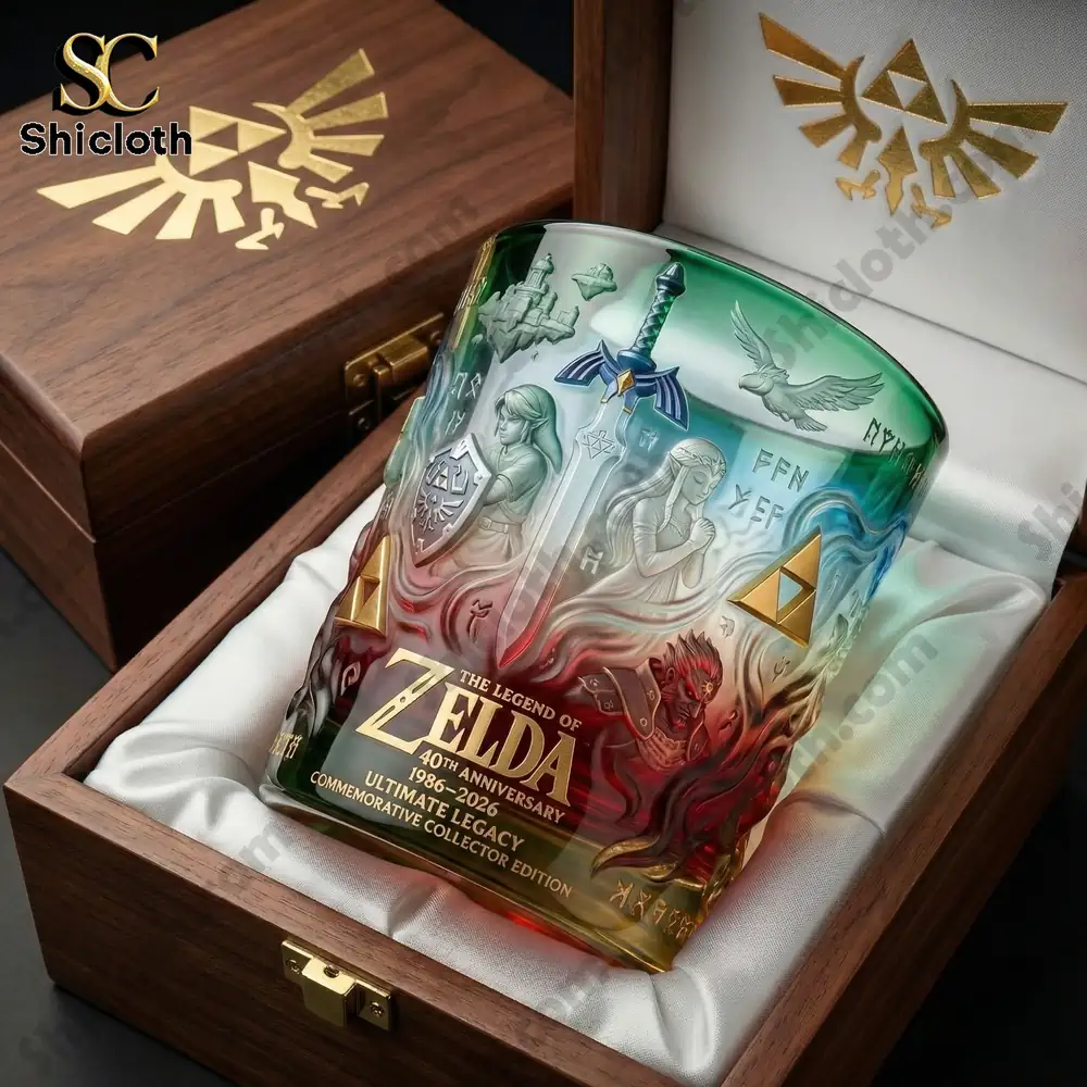 This commemorative collection celebrates four decades of adventure with the Legend of Zelda 40th Anniversary Whiskey Glass, a premium piece designed for fans and collectors alike. Available in two distinct styles—the “Skyward Legacy” and the “Ultimate Legacy”—these glasses are crafted from high-quality, crystal-clear glass featuring vibrant dye-sublimation printing. Each glass comes nestled in a luxurious, custom-engraved wooden display box lined with white satin, making it a standout decorative keepsake or a functional vessel for your favorite spirits.
