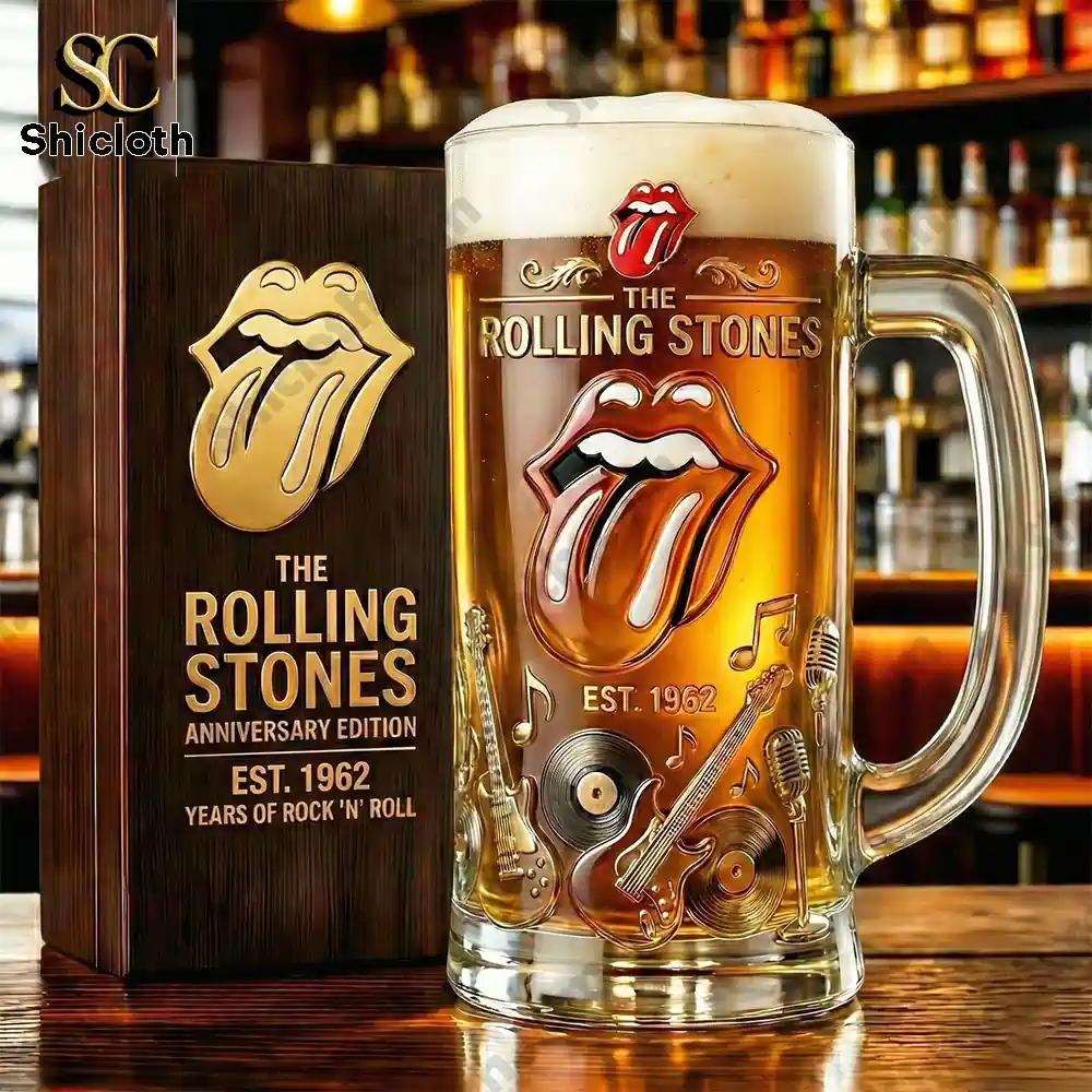 The Rolling Stones Est 1962 Anniversary Edition Beer Glass is a premium tribute to decades of rock ‘n’ roll history, blending a rugged musical aesthetic with high-quality craftsmanship. This collector’s piece features the iconic “Tongue and Lips” logo prominently in the center, surrounded by intricate 3D-style embossed musical motifs including electric guitars, vinyl records, and musical notes.
