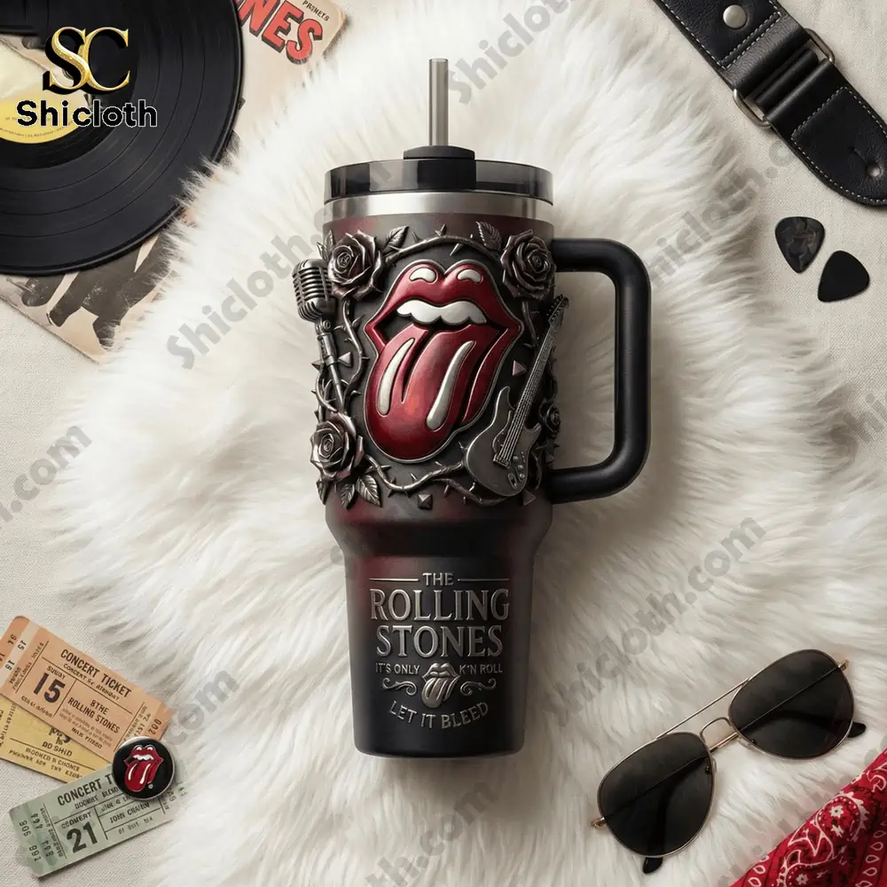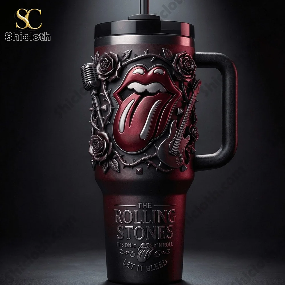 This Rolling Stones “It’s Only Rock ‘N Roll / Let It Bleed” Tumbler is the ultimate tribute for fans who want to combine their love for legendary rock with everyday utility. Featuring a stunning 3D-embossed design, this tumbler stands out with its deep burgundy and matte black finish, showcasing the iconic “Hot Lips” logo surrounded by intricate raised metallic roses, a vintage microphone, and an electric guitar. The base of the cup is elegantly engraved with the band’s name and classic album titles, creating a premium tactile experience that feels as good as it looks.
