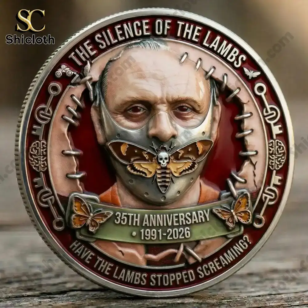 The coin features a striking dual-sided design with a premium antique silver and gold-tone finish accented by deep crimson red enamel. One side showcases a highly detailed portrait of Hannibal Lecter wearing his iconic barred prisoner mask, with a Death’s-head hawkmoth resting over his mouth. This side is bordered by barbed wire motifs and small bone-like carvings, featuring the chilling inscription “Have the lambs stopped screaming?” at the bottom. The reverse side highlights a large “35” set against the silhouette of Clarice Starling and another moth, including the famous quote “quid pro quo, Clarice.” across a scroll. The entire piece is struck from a durable zinc alloy or brass composite, ensuring a heavy, substantial feel in the hand that resists tarnishing over time.