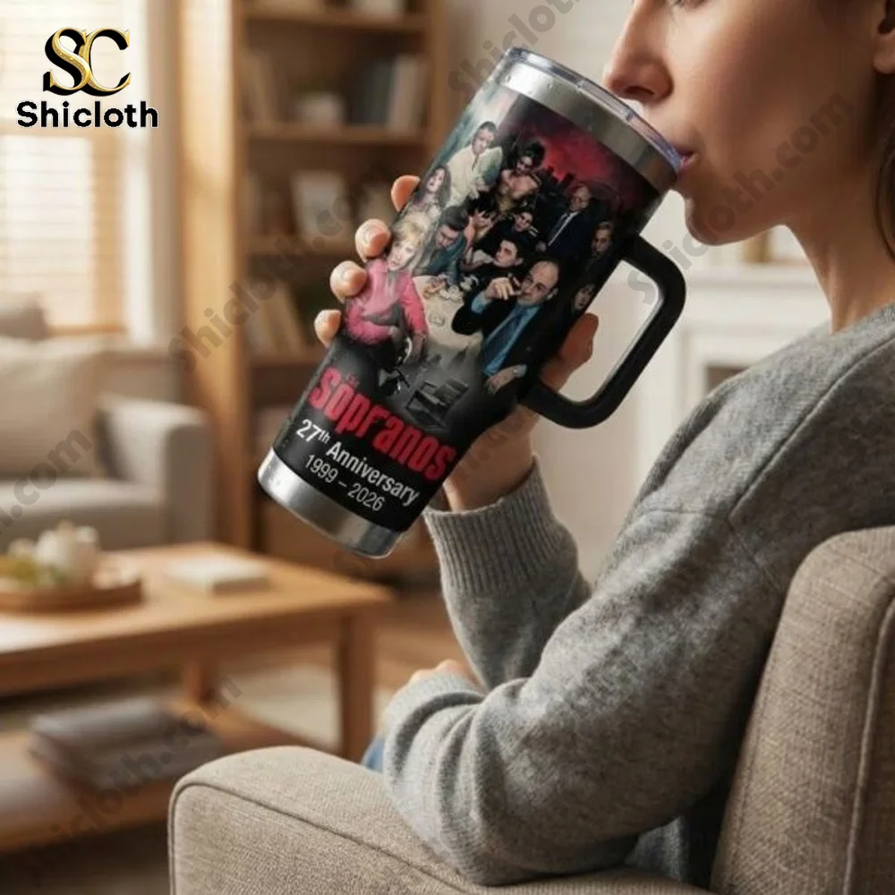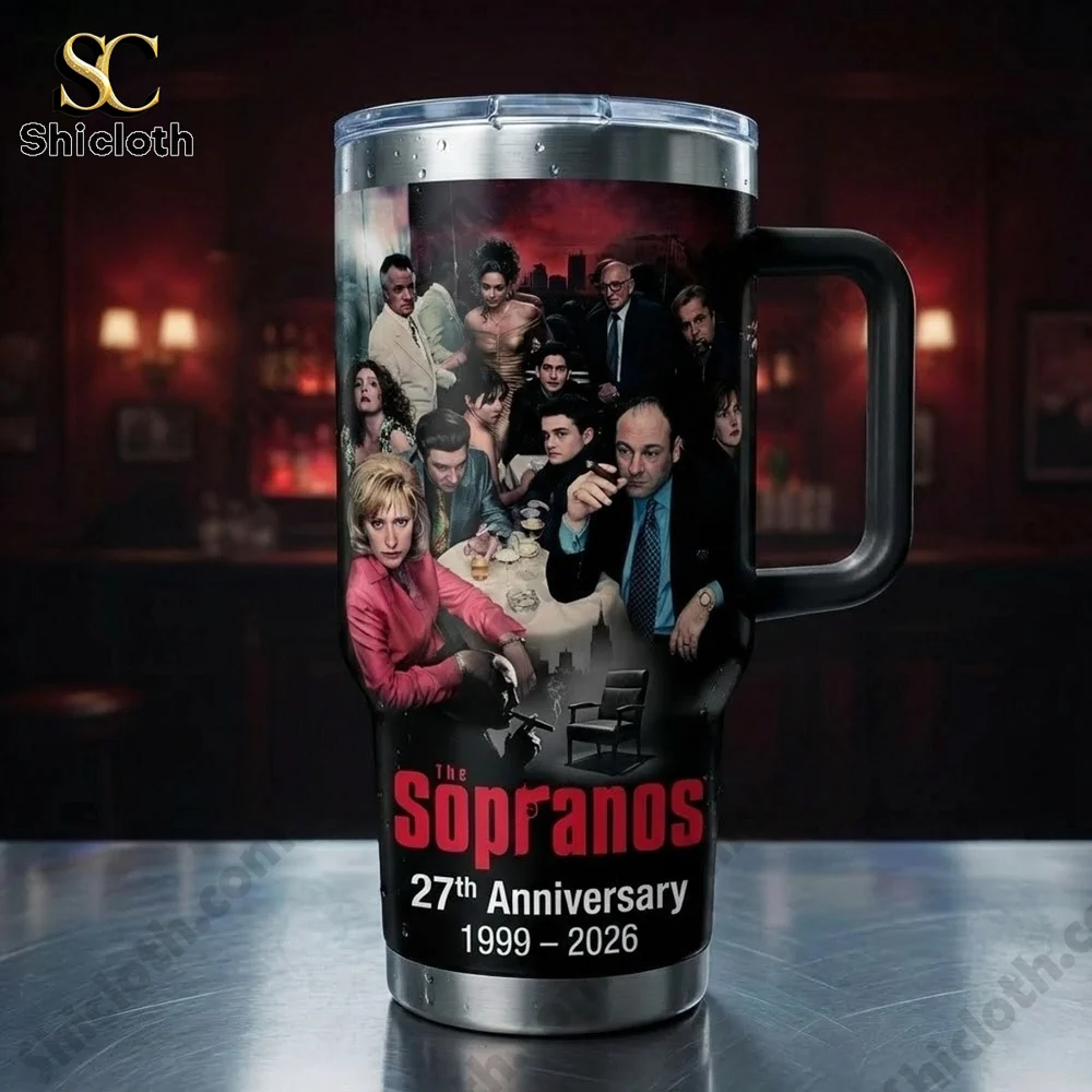 If you are a true fan of the DiMeo crime family, this limited edition The Sopranos 27th Anniversary 1999-2026 Tumbler is the ultimate tribute to the show that changed television forever. Featuring a striking high-definition wrap, the design captures the iconic “Last Supper” style imagery of Tony Soprano and his crew gathered around the table, set against a moody, deep red and black backdrop. The lower section prominently displays the classic series logo and the commemorative dates in bold white and red text. Whether you prefer the sleek tapered version with a straw or the rugged model featuring a sturdy ergonomic black handle, each piece is a collector’s item designed to keep your drinks at the perfect temperature while you re-watch your favorite episodes.