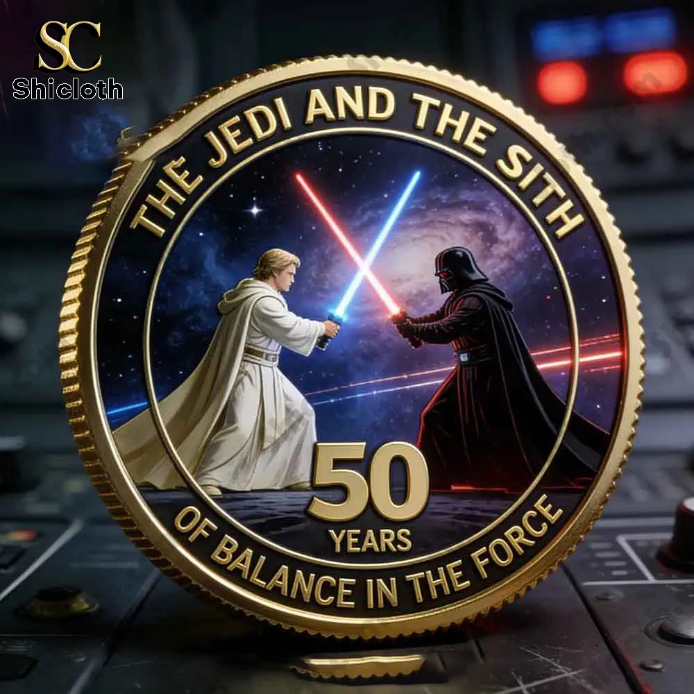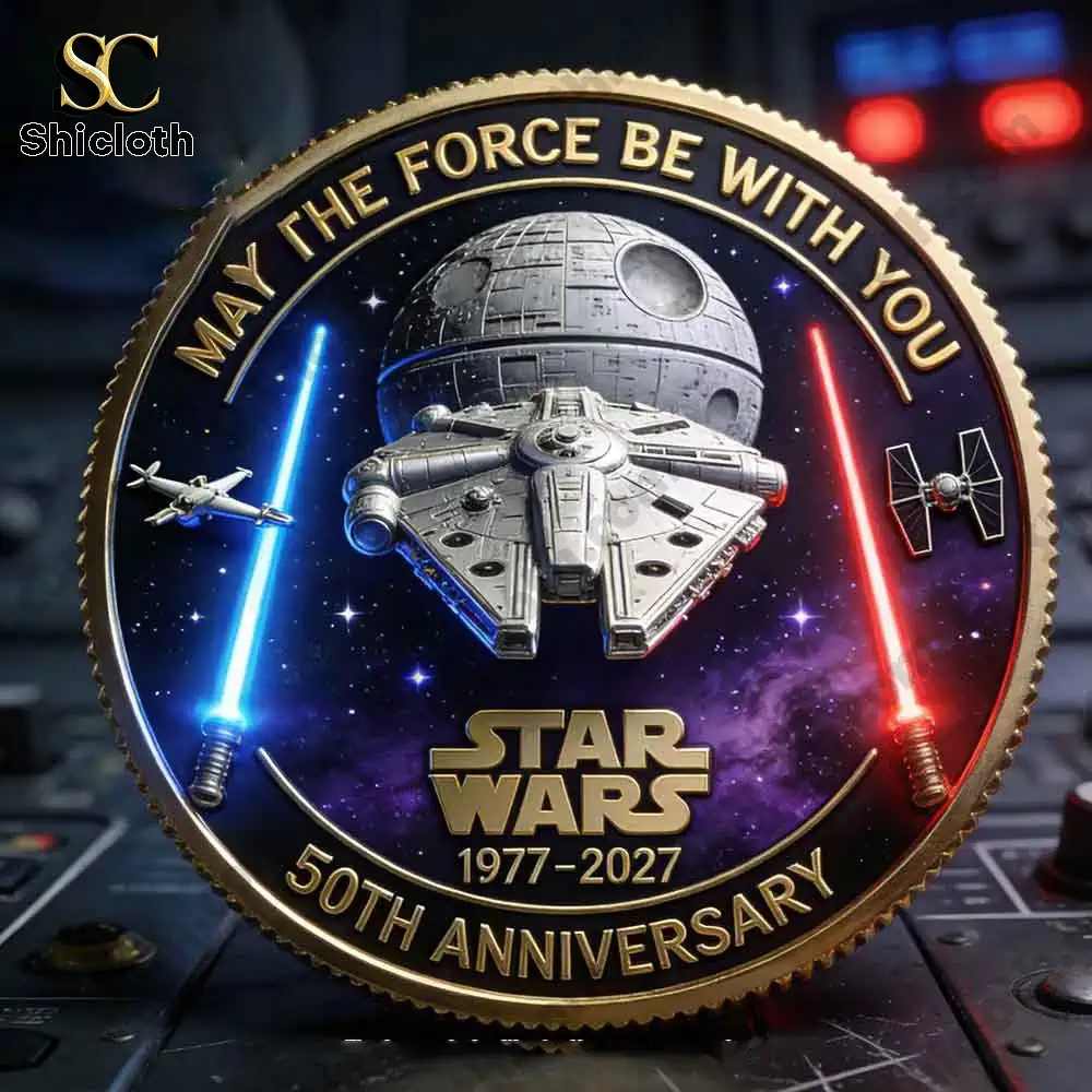 One side of this high-quality metal coin features the legendary Millennium Falcon and an X-Wing soaring past the Death Star, framed by the classic quote “May the Force be with you.” On the reverse, an epic duel unfolds between Luke Skywalker and Darth Vader with their glowing lightsabers crossed against a cosmic nebula background. The coin is elegantly finished with a gold-toned serrated edge and includes the significant “1977-2027” and “50 Years” inscriptions to mark this historic milestone. The vivid 3D digital print ensures every star and ship looks sharp and realistic.