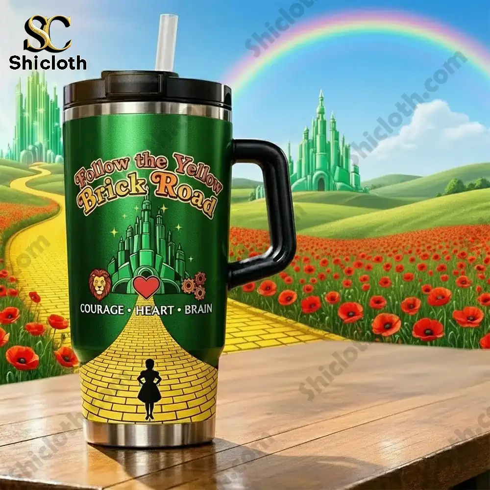 The design is a stunning tribute to the movie, featuring a rich green backdrop that mimics the glow of the Emerald City. You will find the iconic characters—Dorothy, the Scarecrow, the Tin Man, and the Cowardly Lion—walking along a bright yellow brick road that wraps around the base. The text “Follow the Yellow Brick Road” is elegantly placed, surrounded by delicate poppy flower motifs and sparkles that catch the light. Made from high-quality inox stainless steel, the tumbler uses a double-wall insulated design to maintain your drink’s temperature. Whether you are keeping water icy cold during a summer beach trip or sipping hot cocoa by a winter fire, the thermal retention is incredibly reliable.