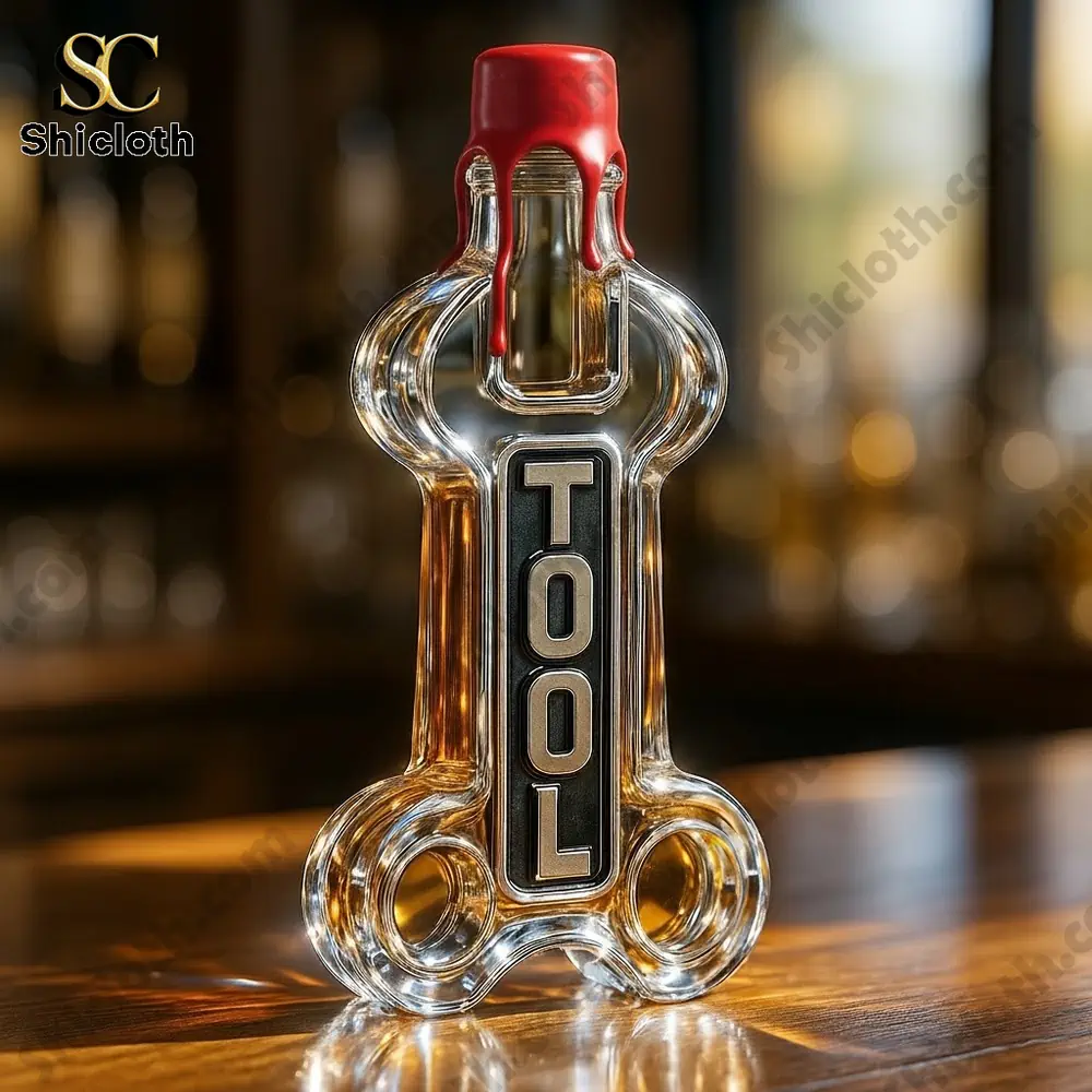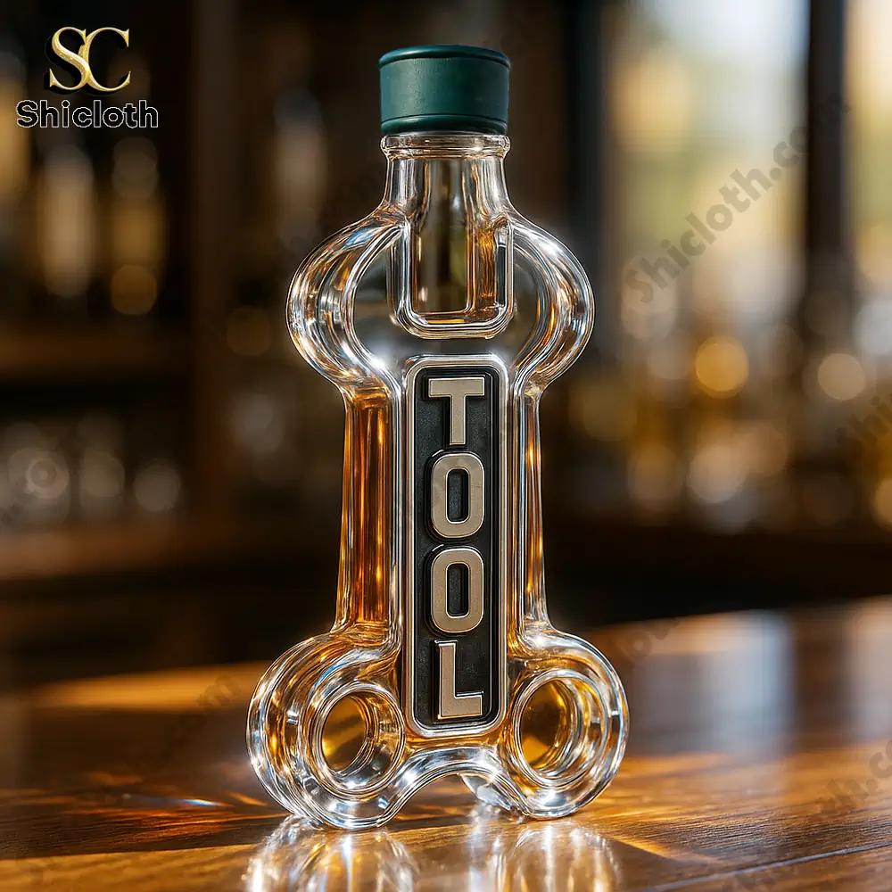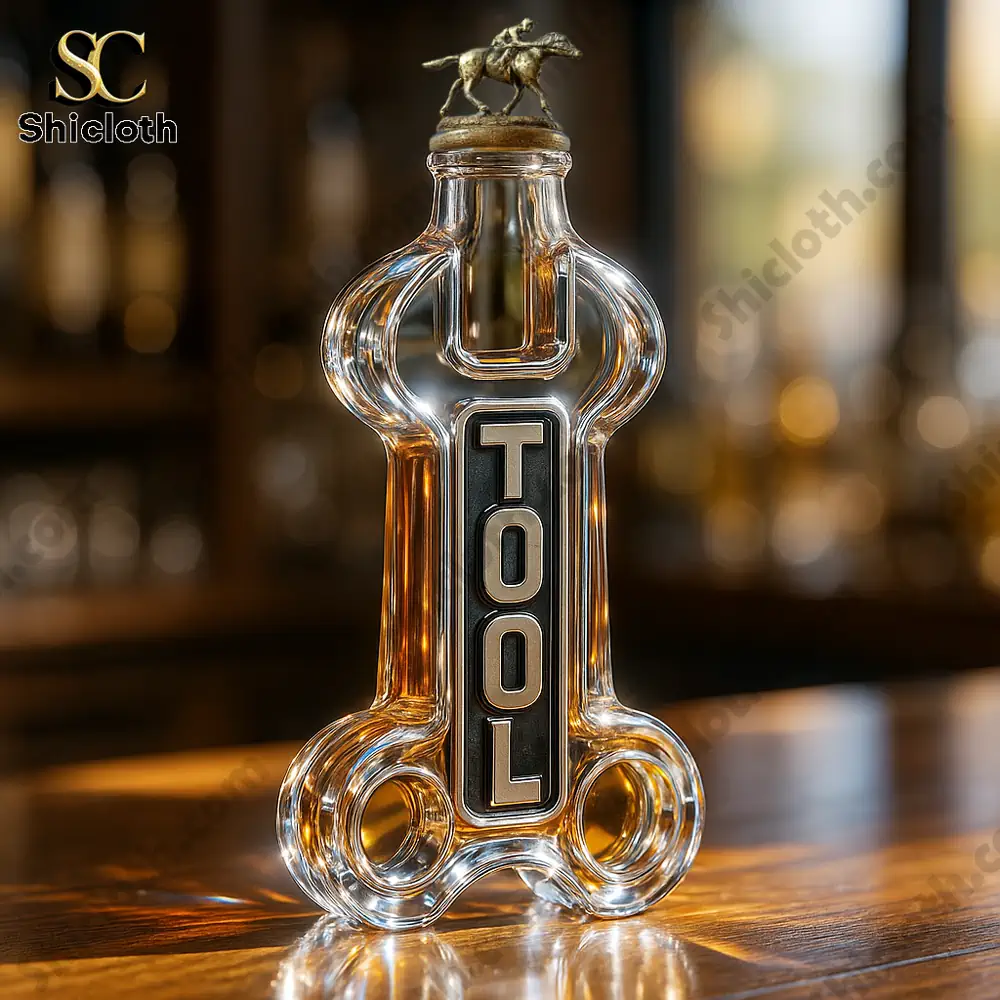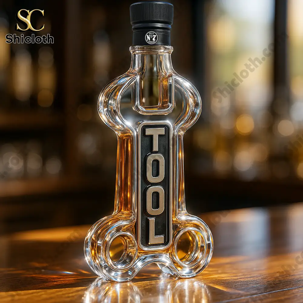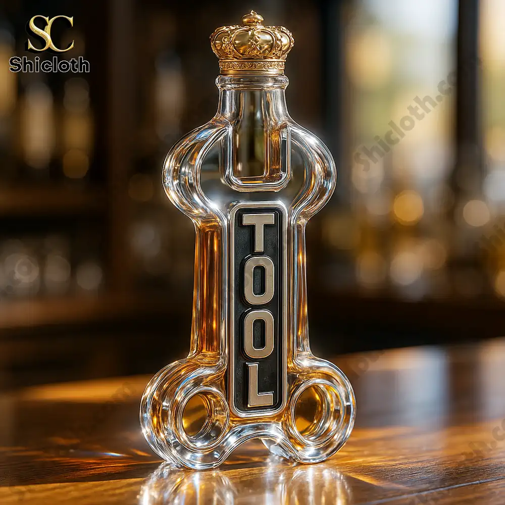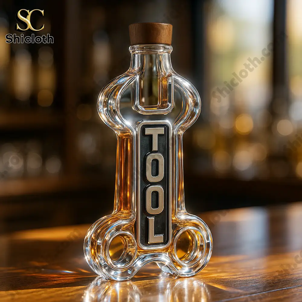 This limited edition bottle is crafted from premium, high-quality glass that catches the light beautifully, giving the liquid inside a warm, golden glow. The striking central vertical panel features the word “TOOL” in bold, metallic lettering that stands out against the rich amber hue of the spirit it contains (or will contain, as the bottle is sold empty). The bottle itself is cleverly designed in the shape of a wrench, measuring approximately 20*10cm and holding 350ml. Every detail, from the polished sheen of the glass to the textured design elements, is precise. The base features two open circles, completing the wrench shape, which adds a unique, balanced look on any surface, like a bar counter or a luxurious living room rug, as seen when paired with a concert playing on screen.