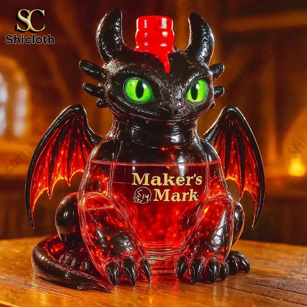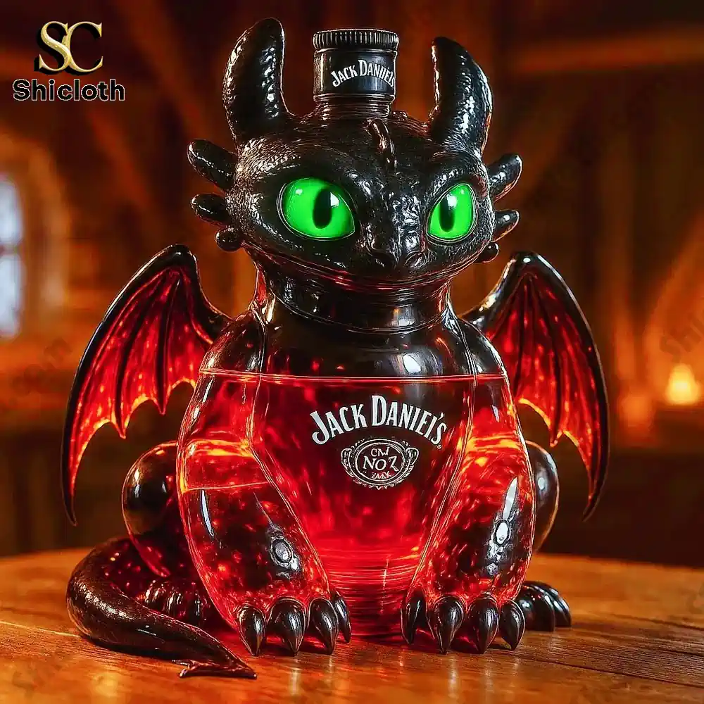 The decanter is a magnificent, highly detailed sculpture of the dragon Toothless sitting with his wings slightly spread. The main body, including the head, feet, and tail, is made from a deep, opaque black glass, perfectly mimicking the Night Fury’s sleek hide. The clear glass mid-section forms the belly of the dragon, which holds the liquid and creates a spectacular effect: when filled with a red or amber spirit, the translucent red wings and the glass body glow with the intensity of fire and plasma blasts. Toothless’s face is brought to life with striking oversized bright green eyes that give the dragon its signature intelligent and curious look. The neck of the bottle is subtly integrated into the top of the head, accommodating various stoppers, from a simple cap (Jack Daniel’s, Jameson) to a majestic crown (Crown Royal) or a sculpted jockey (Blanton’s), offering fantastic customization.