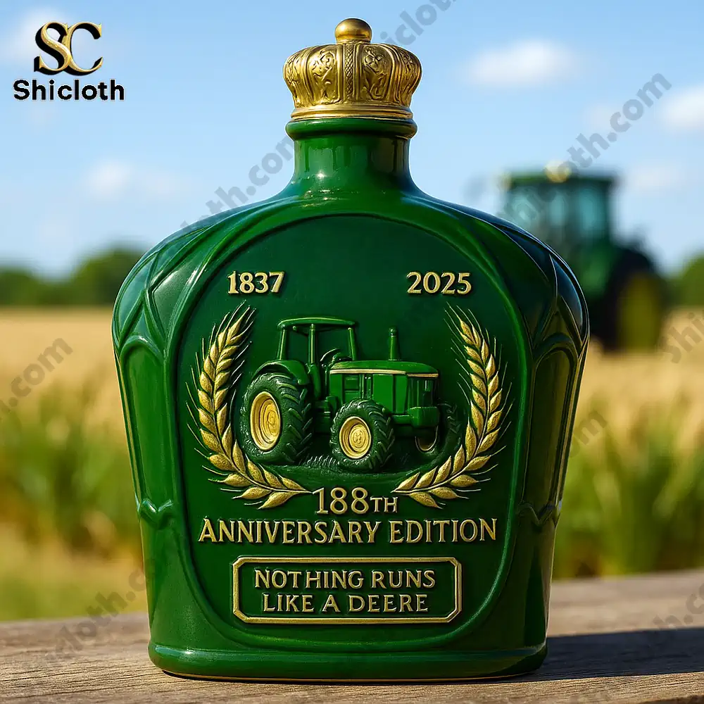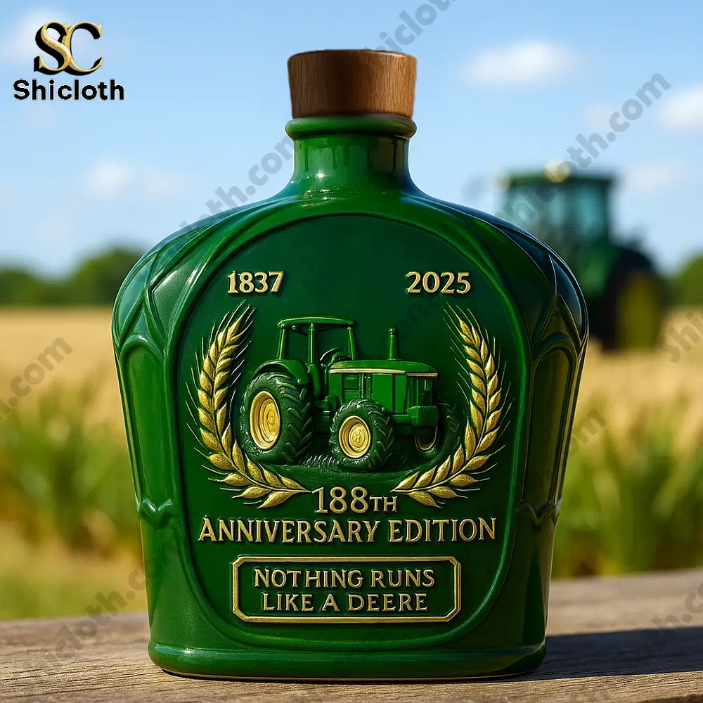 Check out this stunning Tractor 188th Anniversary Edition Whiskey Bottle, a limited edition collector’s piece that brings a touch of rustic charm to your home bar. This 350ml premium glass decanter features a deep forest green finish with a detailed 3D relief of a classic tractor framed by golden wheat stalks. The bottle proudly displays the years 1837 and 2025 alongside the iconic slogan Nothing Runs Like A Deere. Whether you are a fan of agricultural history or a whiskey enthusiast, this empty bottle serves as a versatile container for your favorite spirits or a standout decorative accent.