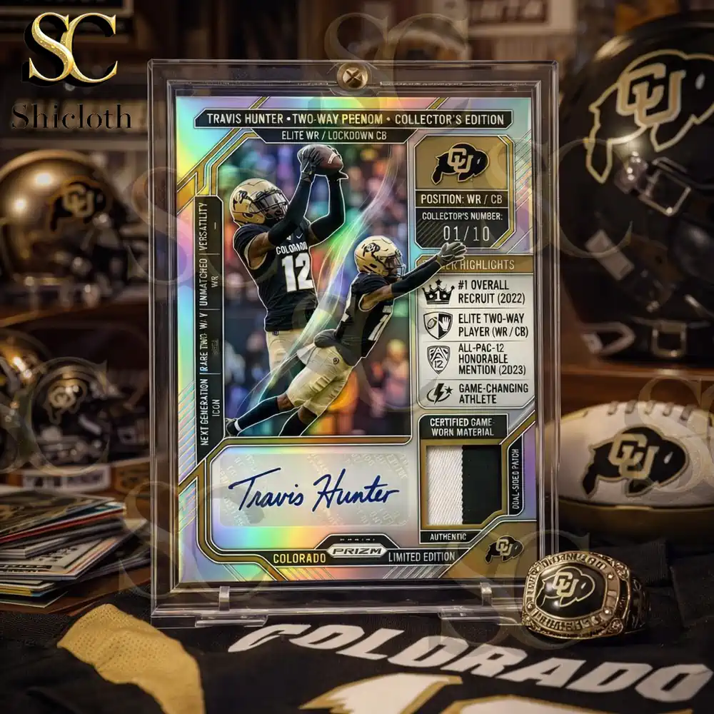 If you are looking for a centerpiece to anchor your sports collection or the ultimate gift for a Colorado Buffaloes fan, this Travis Hunter Rookie Auto Patch Prizm Card is the definitive choice. This collector’s edition masterpiece captures the electric energy of a generational talent, combining high-end design with the prestige of a rare memorabilia piece. It serves as both a high-value asset for serious hobbyists and a stunning decorative keepsake for any sports enthusiast.