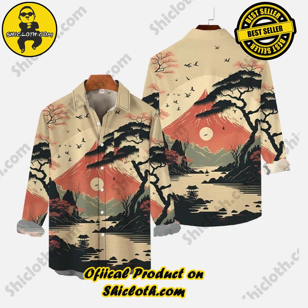 Overview of the Ukiyo-E Japanese Style Retro Mount Fuji Printing Breast Pocket Long Sleeve Shirt:
