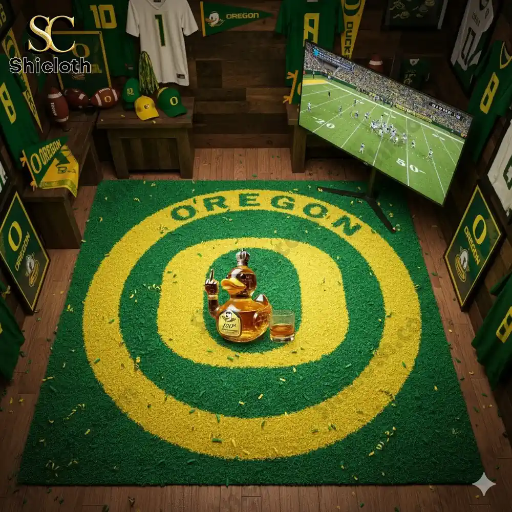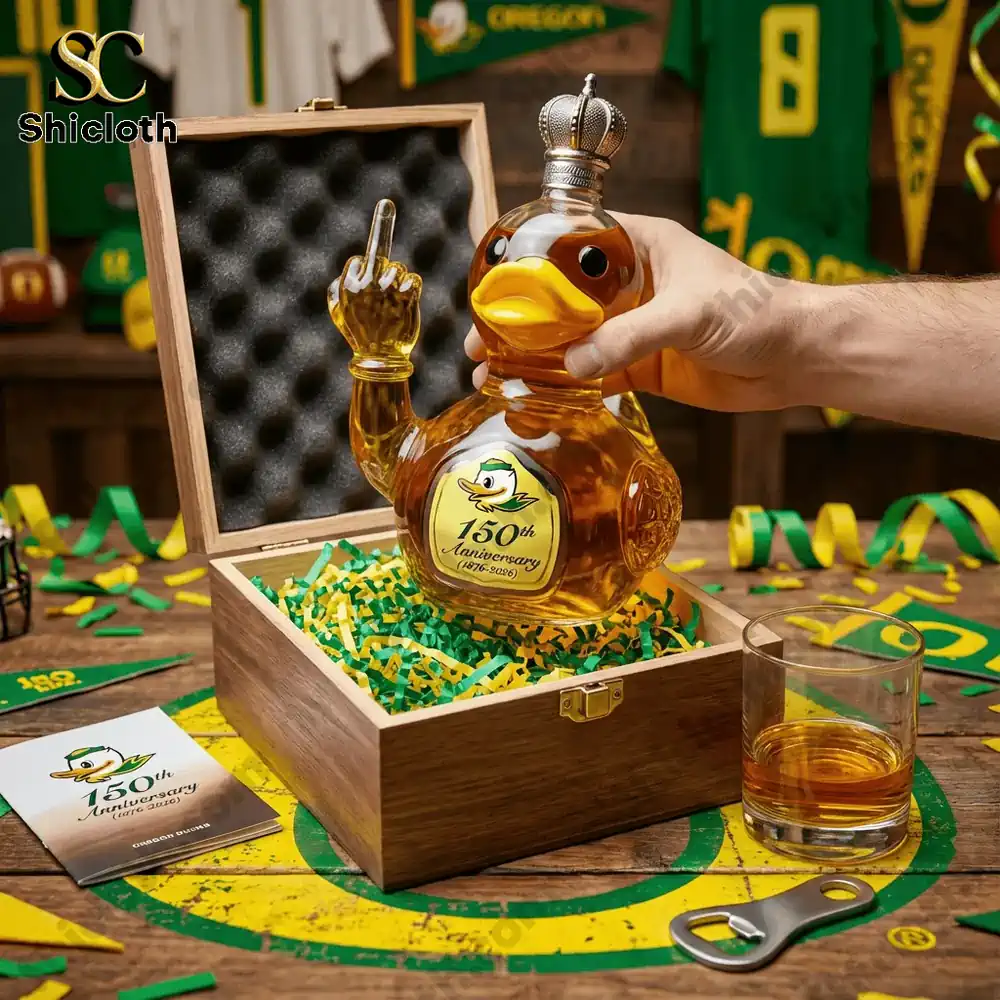 This premium glass decanter features a meticulously crafted duck shape with a high-gloss finish that mimics the iconic Oregon Duck mascot. The body of the duck is made from transparent high-quality glass, allowing the rich amber hues of your favorite whiskey to shine through. On the front, you will find a vibrant yellow label featuring the Oregon Duck logo and the text 150th Anniversary (1876-2026). One of the most unique details is the duck’s left wing, which is raised in a playful, defiant middle-finger gesture, adding a pop-culture edge to the classic mascot. To complete the look, the decanter features a detailed silver crown stopper, inspired by the Crown Royal aesthetic, which provides an airtight seal to keep your spirits fresh.