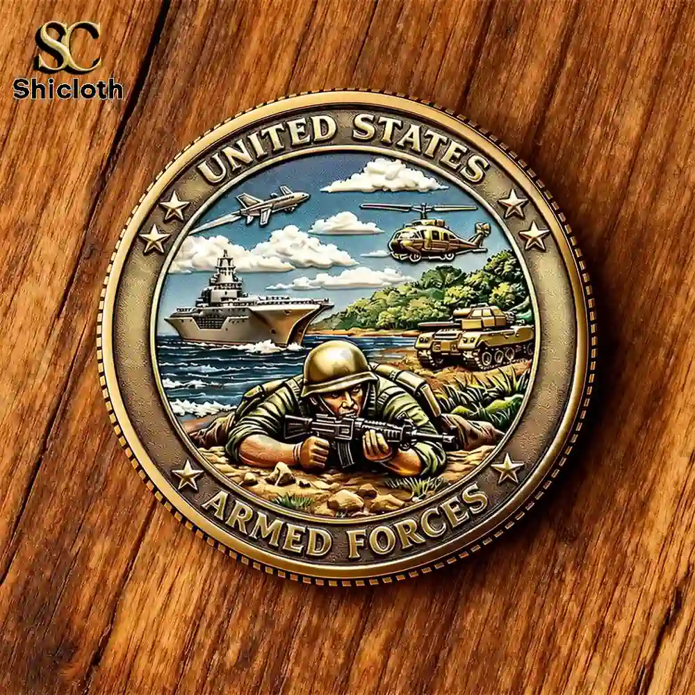 On the reverse side, the coin pays tribute to the joint efforts of the military with the inscription “UNITED STATES ARMED FORCES.” The artwork depicts a soldier in action with a rifle, surrounded by iconic machinery including a fighter jet, a Huey helicopter, a naval carrier, and a tank. This side is crafted from a heavy-duty metal alloy with an antique bronze finish, ensuring the coin feels substantial in the hand and resists tarnishing over time. Because of its weather-resistant coating, this coin is perfect for carrying in a pocket as a daily reminder of resilience or displaying in a shadow box alongside other military medals and ribbons.