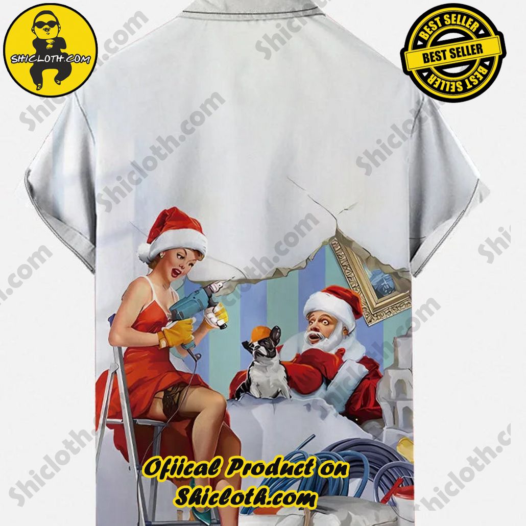 - Suitable for special occasions such as Christmas, birthday, celebration, housewarming gift. Vintage Pin Up Art Christmas Girl And Santa Claus Repairing The House Printing Short Sleeve Shirt