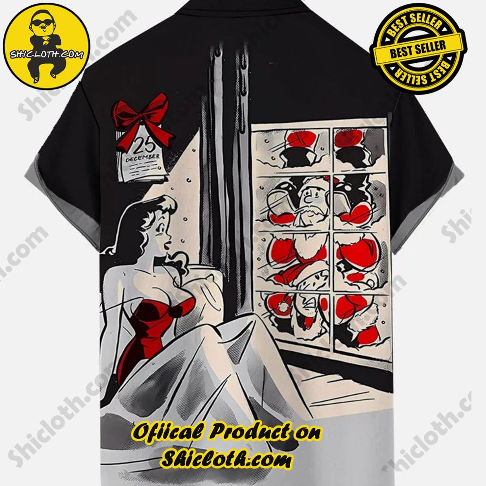 Vintage Pin Up Art Christmas Night Santa Claus And Sexy Beauty Printing Short Sleeve Shirt Version 1