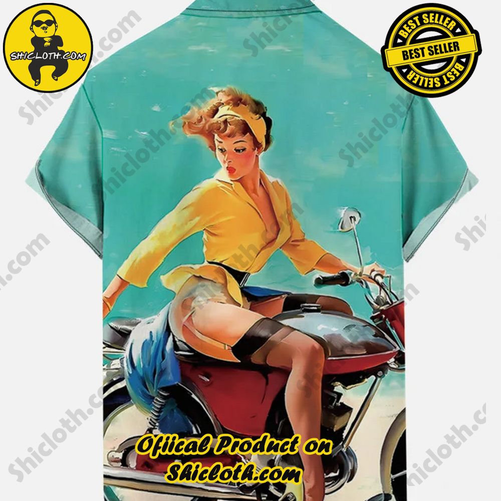 Vintage Pin Up Art Cool Motorcycle Girl Printing Breast Pocket Short Sleeve Shirt