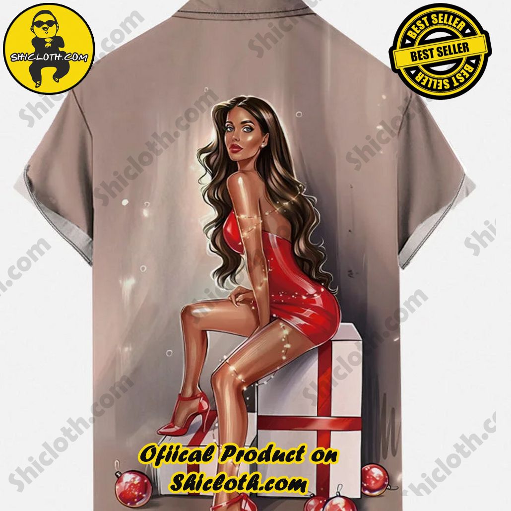 - Suitable for special occasions such as Christmas, birthday, celebration, housewarming gift. Vintage Pin Up Art Sexy Brown-Haired Beauty In Red Dress And Christmas Gifts Printing Short Sleeve Shirt