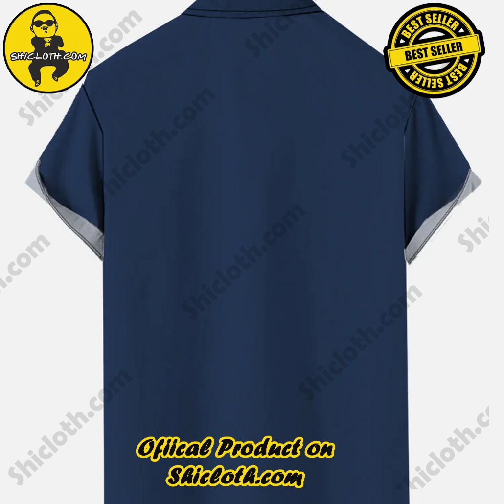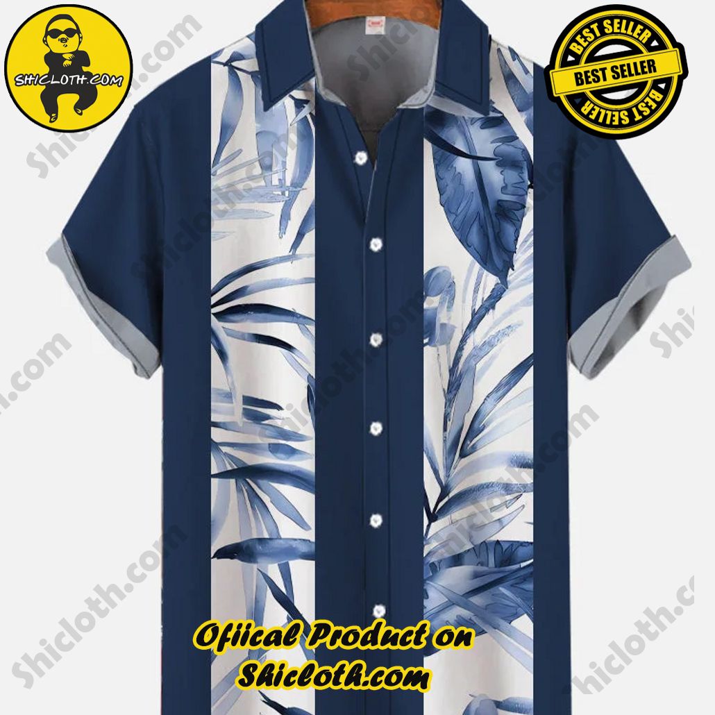 Vintage Stripe Style Blue And White Stitching Palm Waves Printing Short Sleeve Shirt